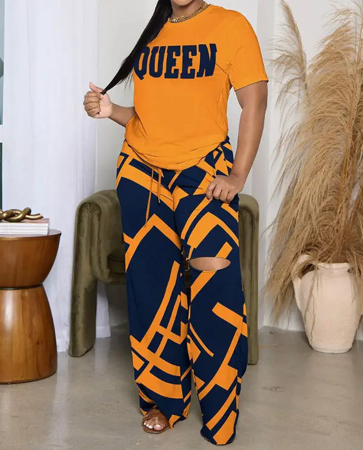 Летний модный комплект из двух предметов с принтом, Женская Повседневная футболка с коротким рукавом и широкие брюки с дырками, костюм из двух предметов для женщин