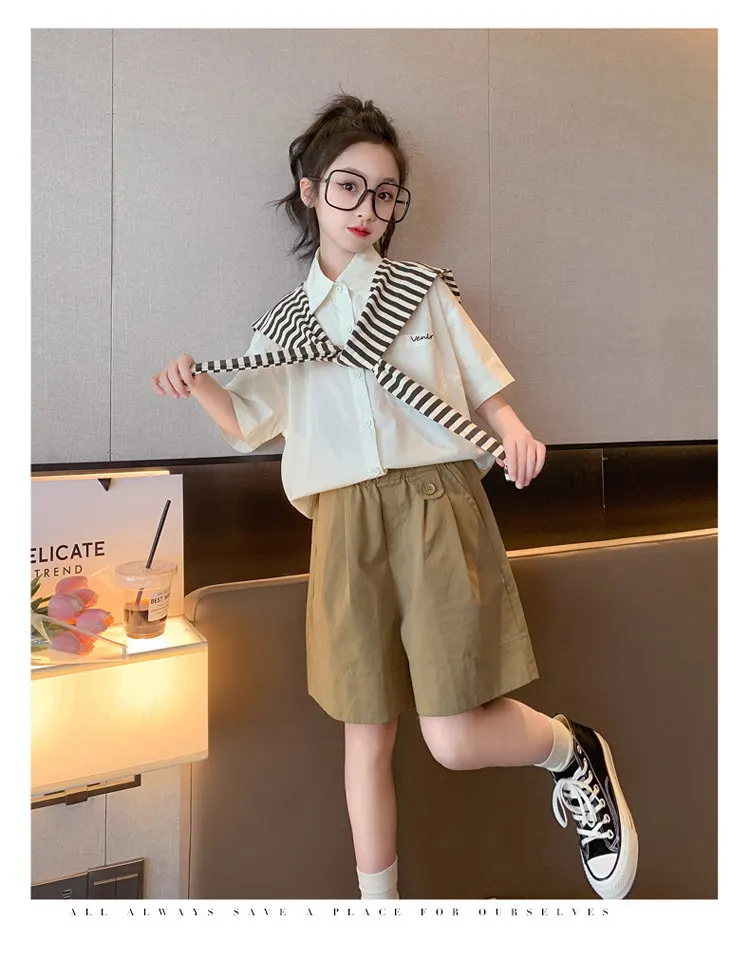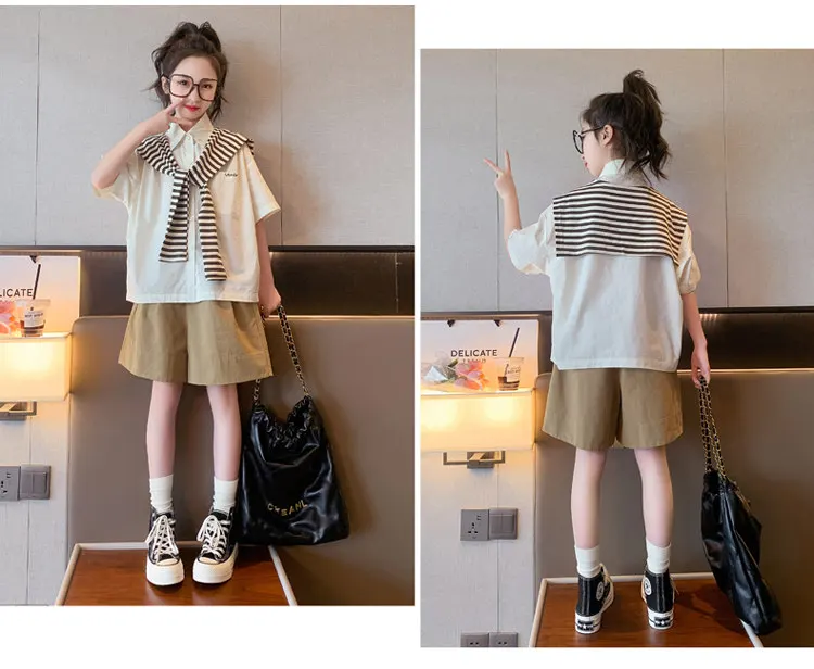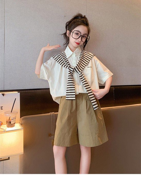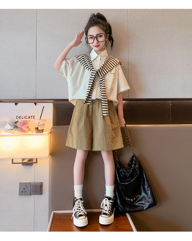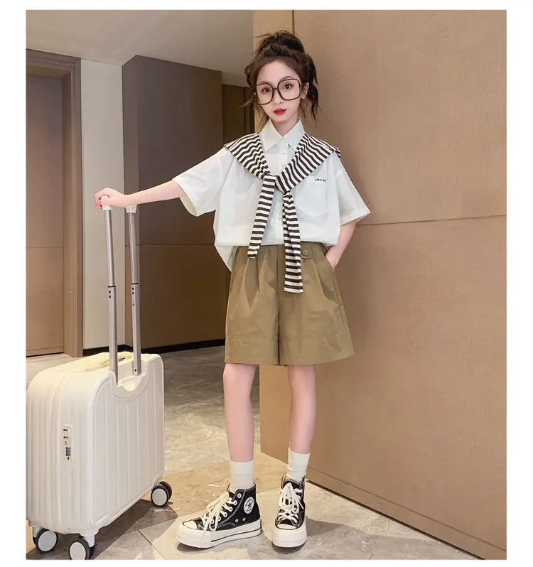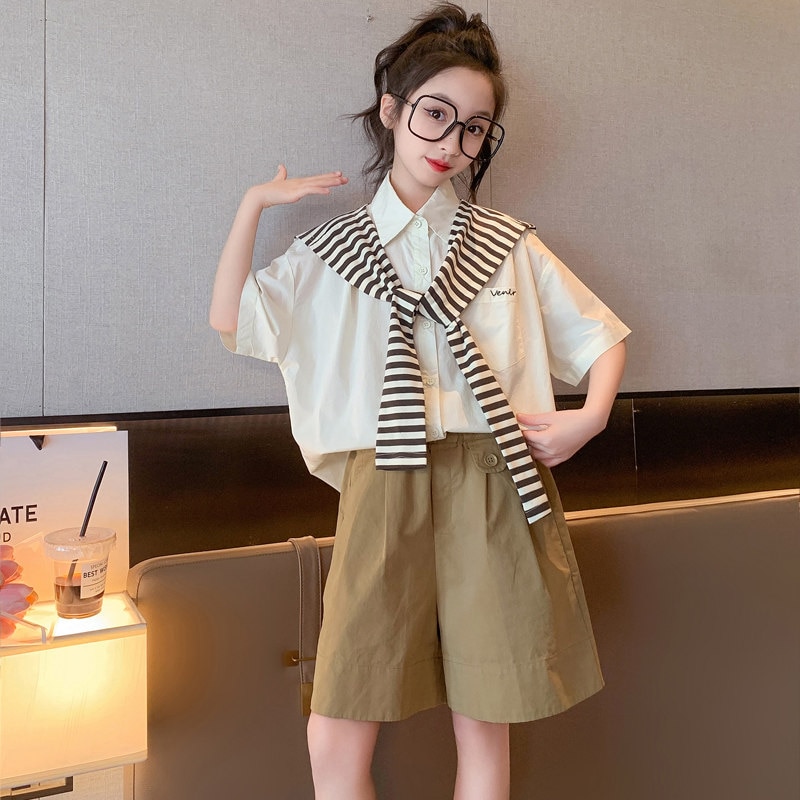 Летний модный комплект одежды для девочек, детский полосатый палантин, рубашка + шорты, комплект из двух предметов, хлопковый повседневный костюм, Корея, для детей