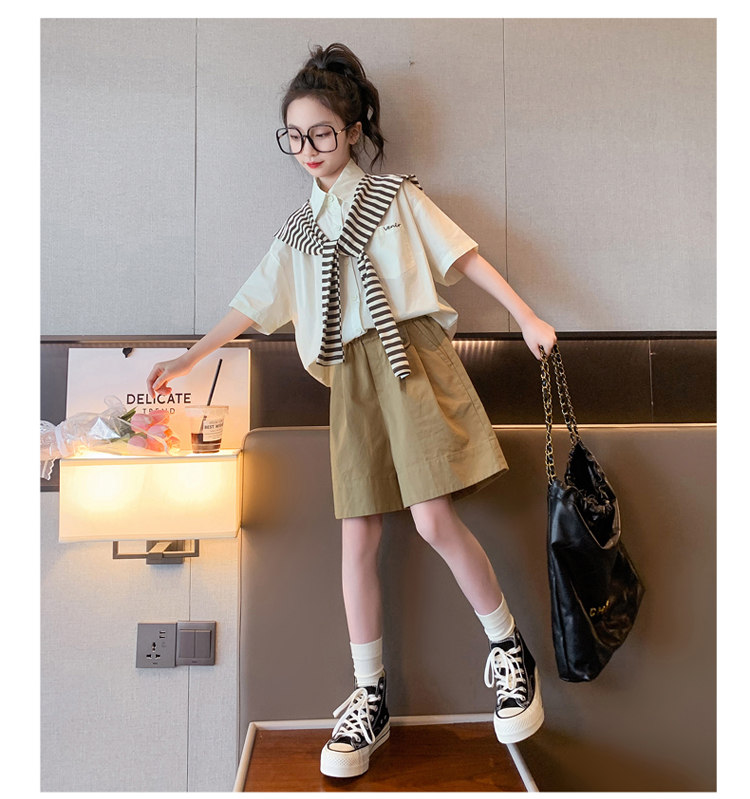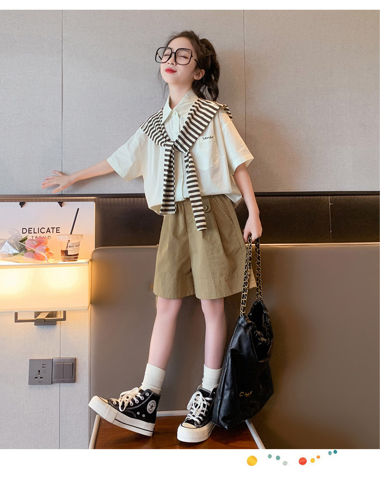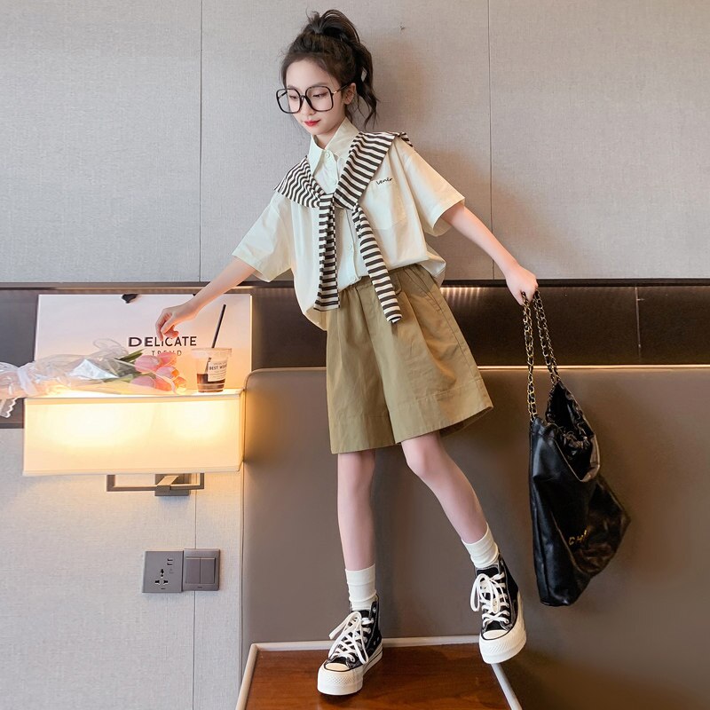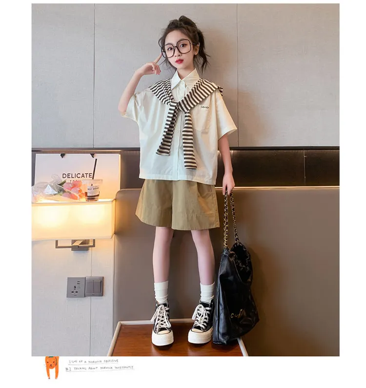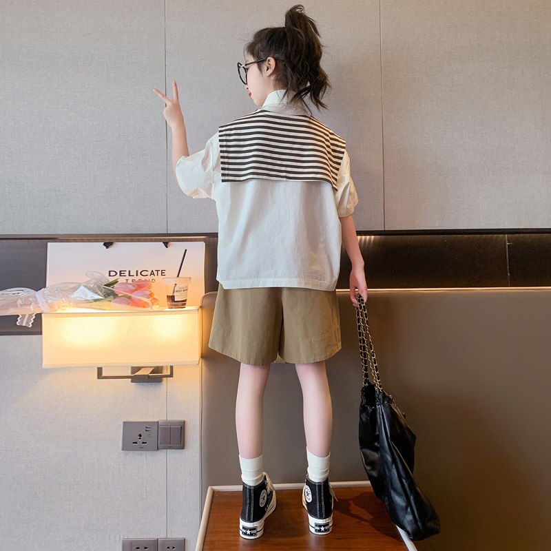 Летний модный комплект одежды для девочек, детский полосатый палантин, рубашка + шорты, комплект из двух предметов, хлопковый повседневный костюм, Корея, для детей