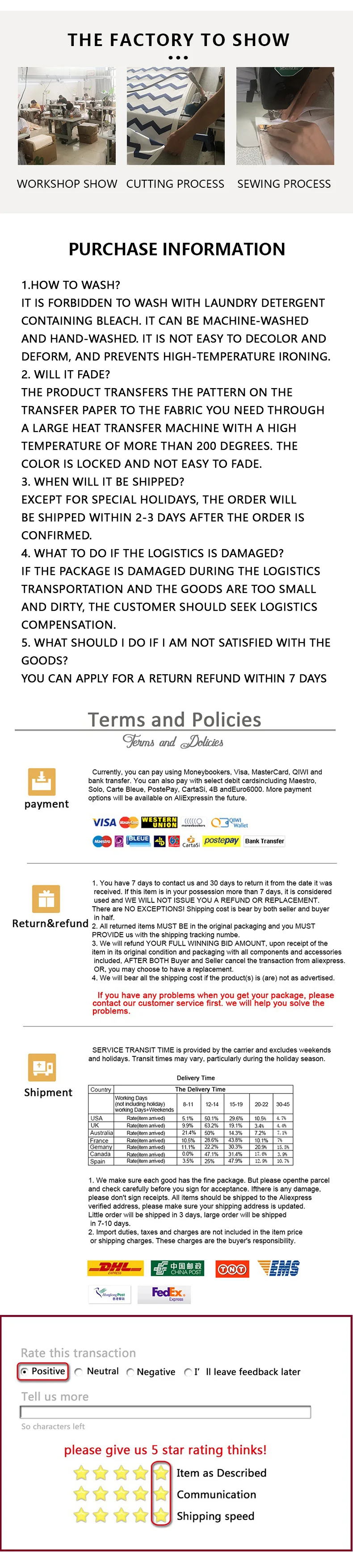 4. При нормальных обстоятельствах приобретенная вами посылка может быть отправлена в течение двух дней, за исключением особых обстоятельств и праздников.