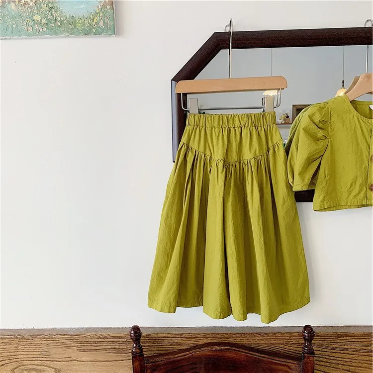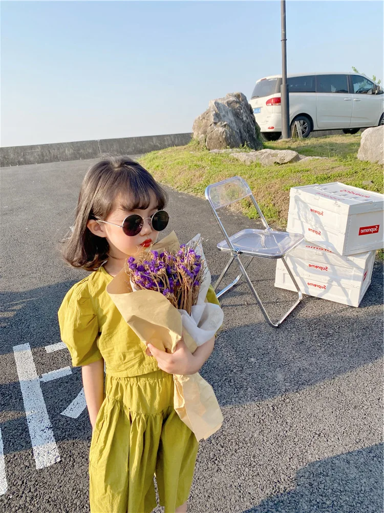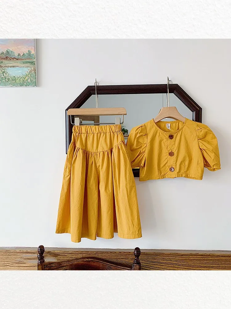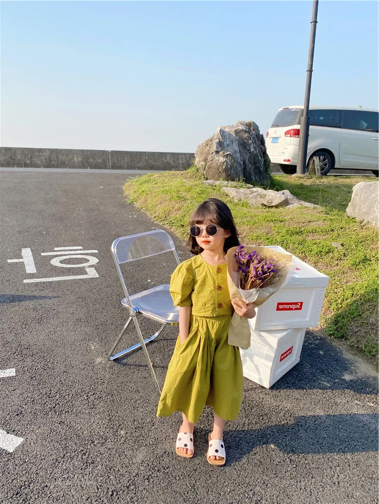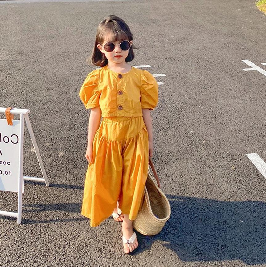 Летняя хлопковая рубашка с оборками и рукавами-фонариками для маленьких девочек + свободные плиссированные Стрейчевые брюки, детский спортивный костюм, комплект из 2 предметов для детей 2-8 лет