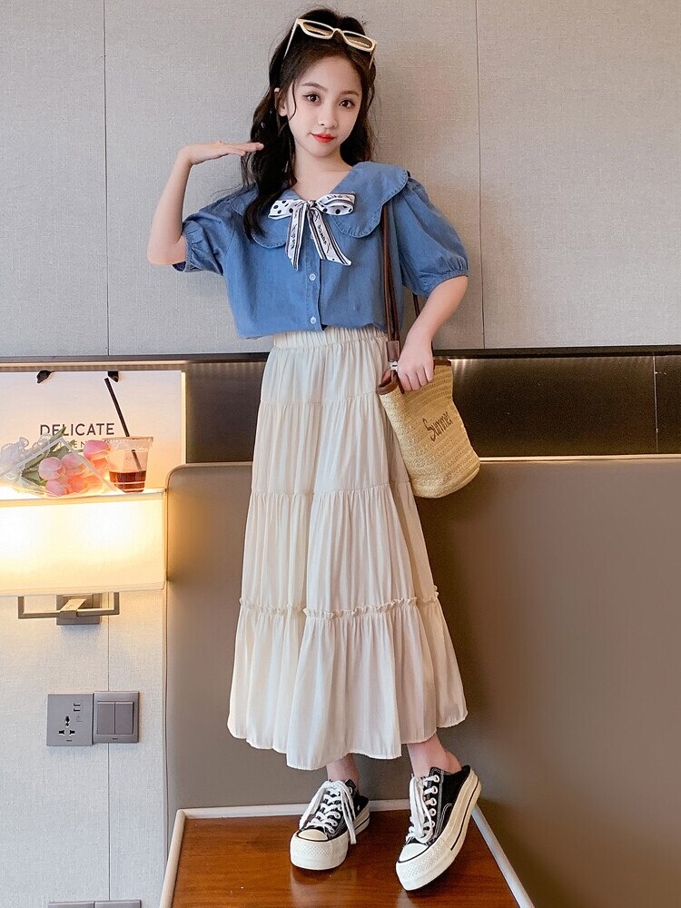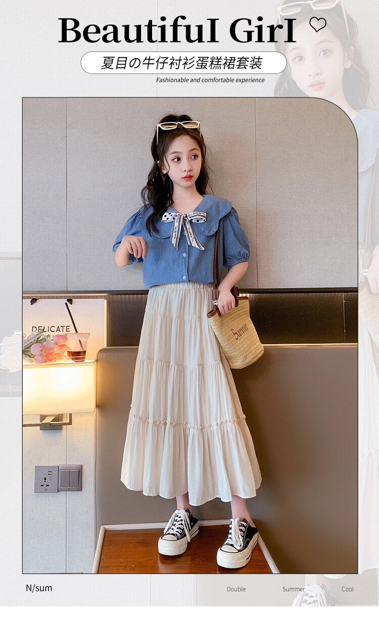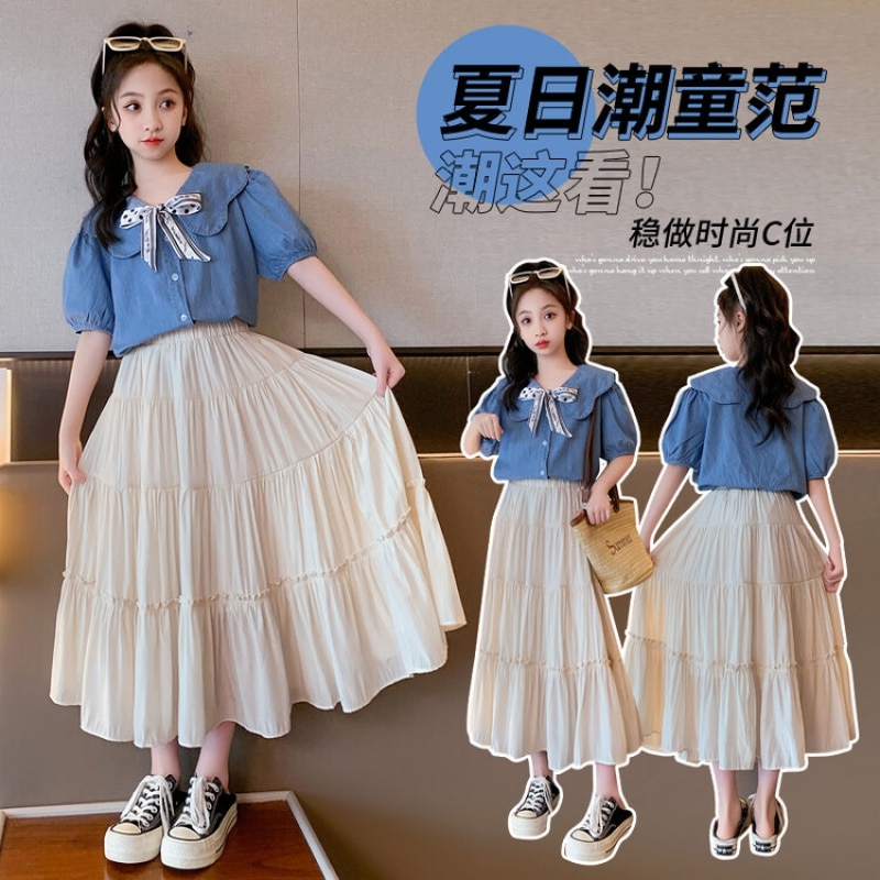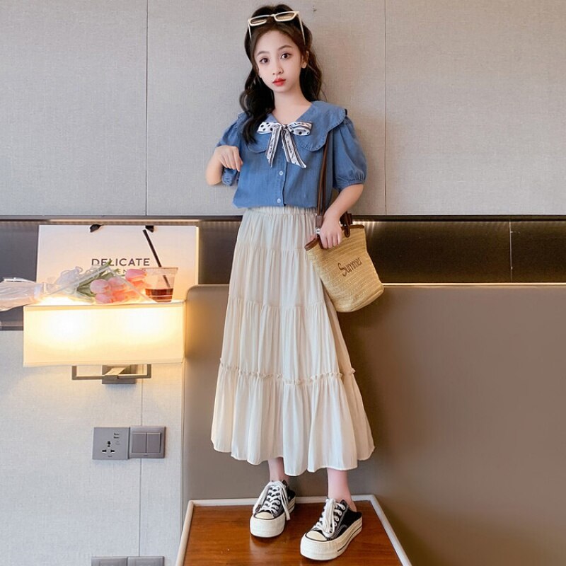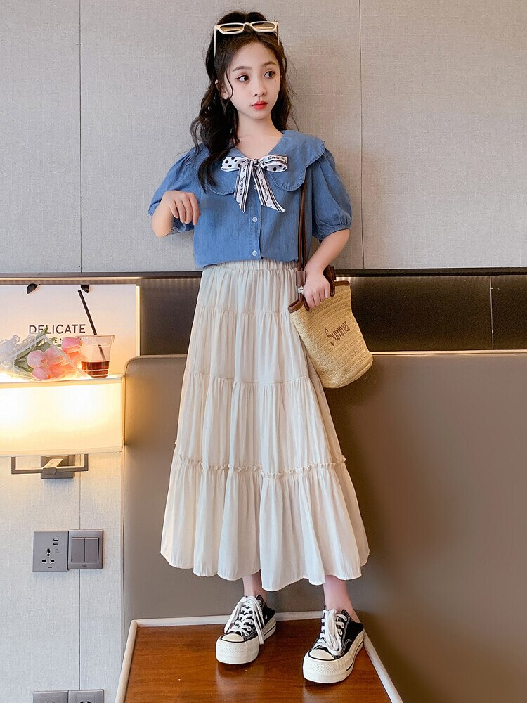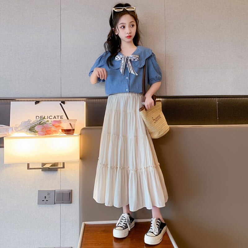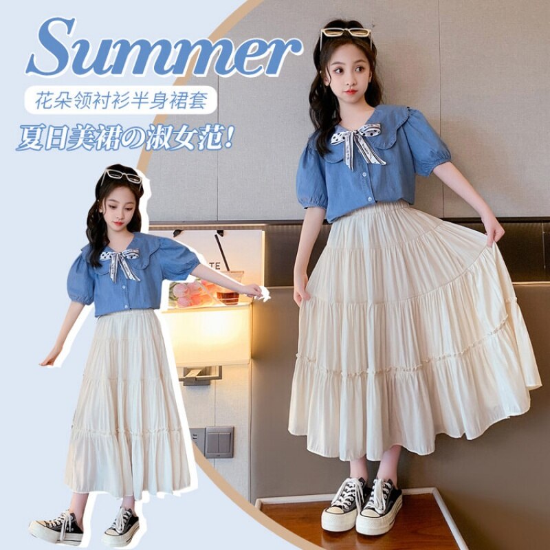 Летняя одежда для девочек, костюм, джинсовая рубашка, юбка в стиле колледжа, повседневный модный костюм свободного кроя, детская одежда для девочек 4-16 лет