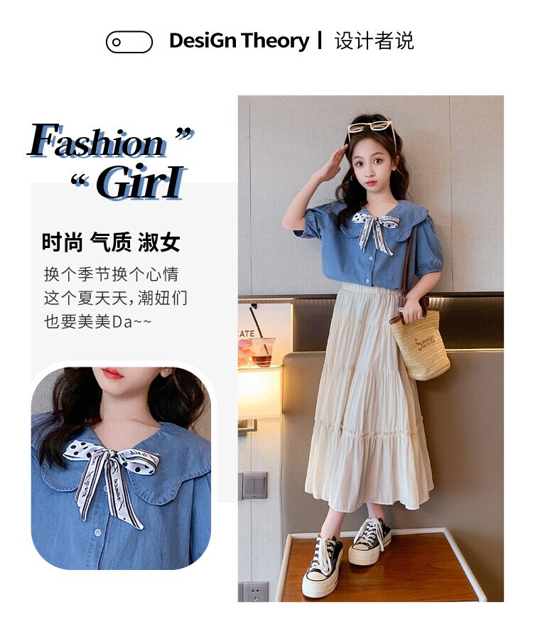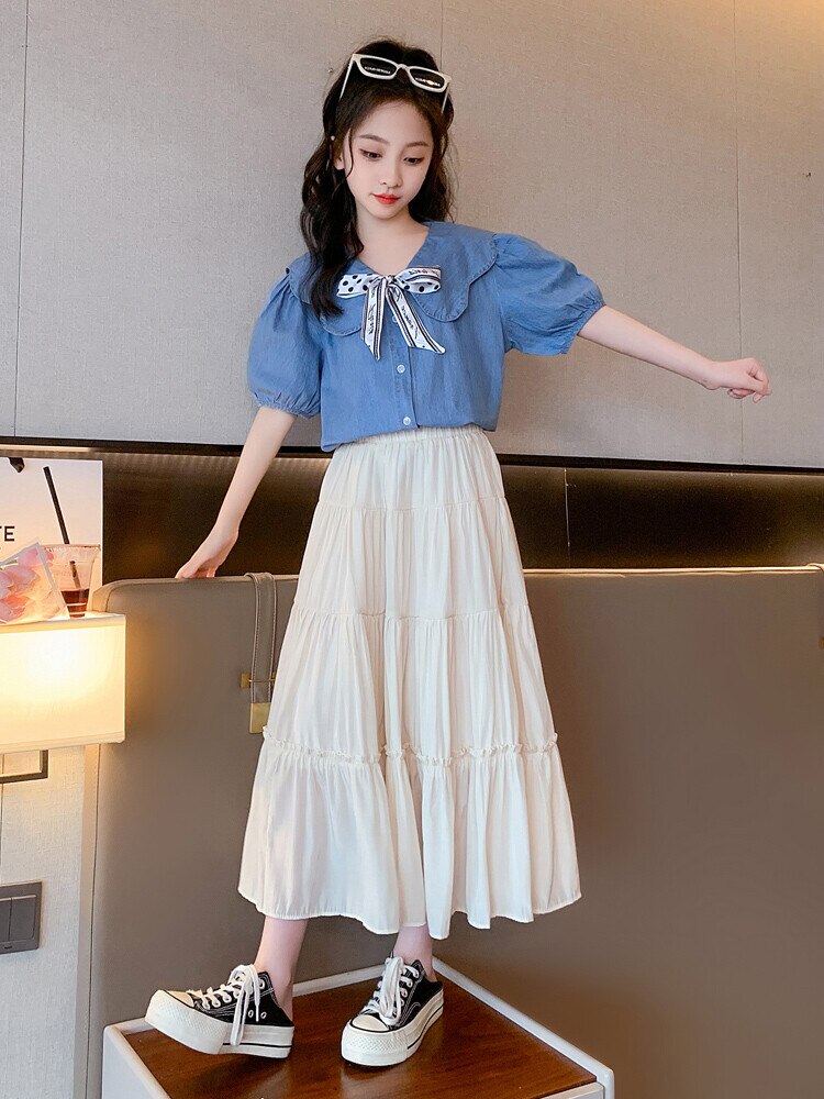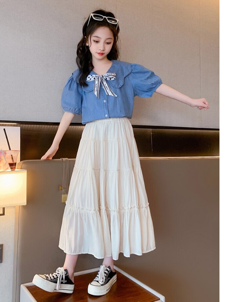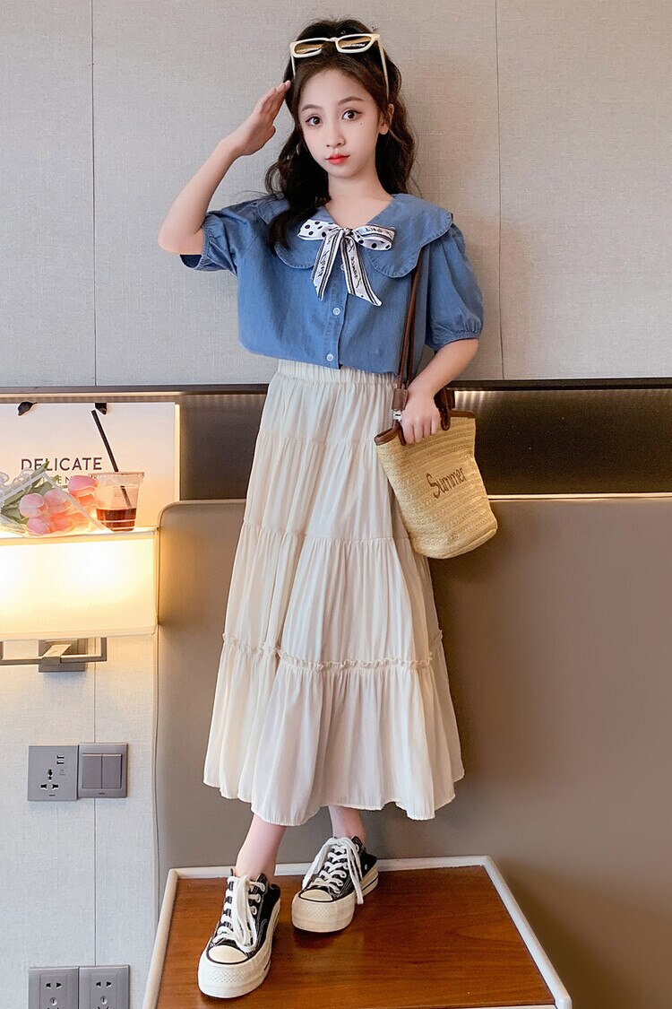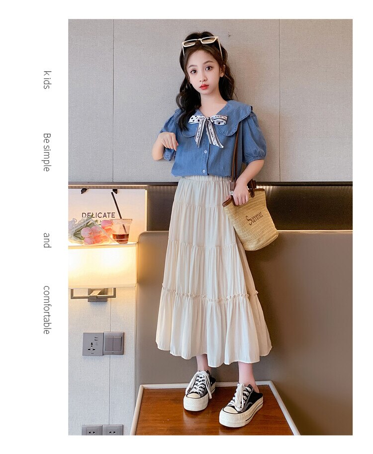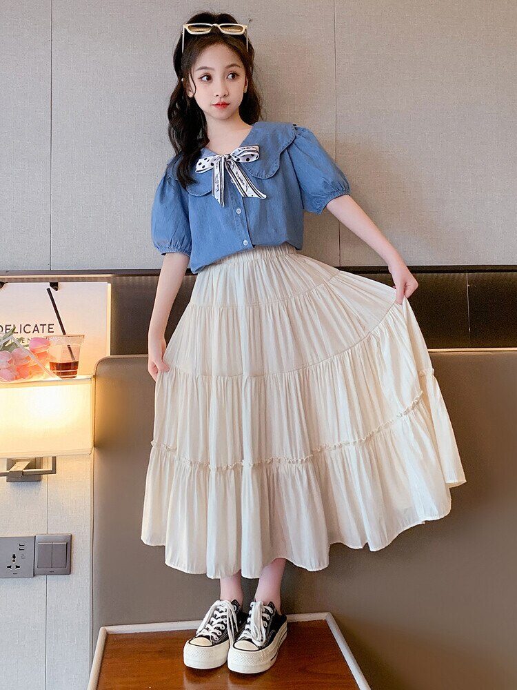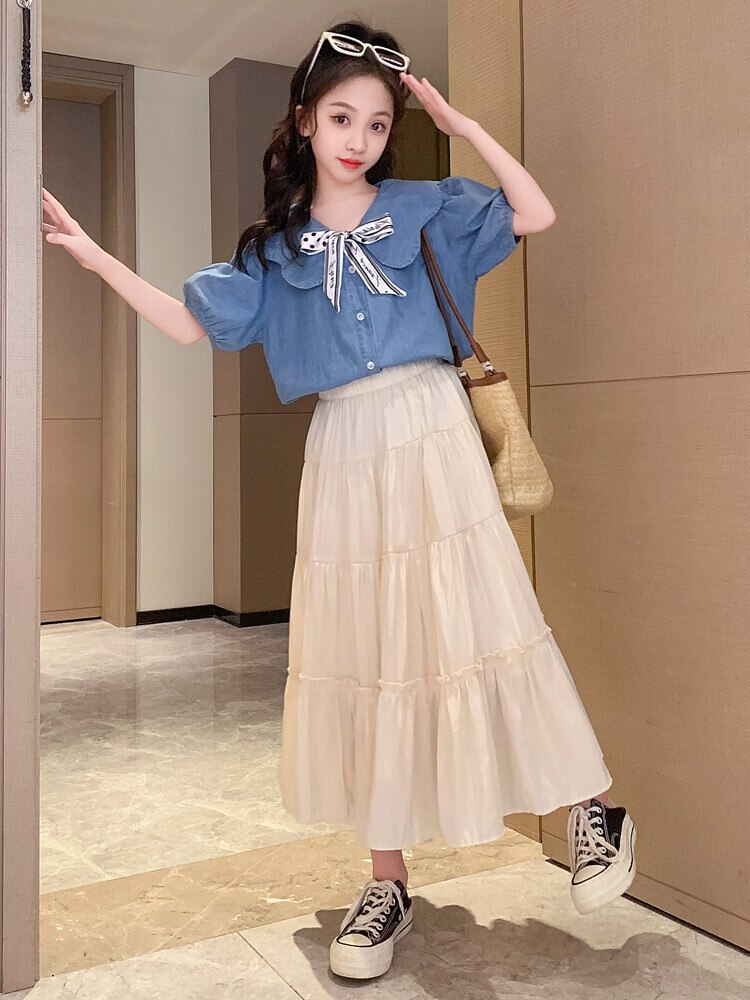 Летняя одежда для девочек, костюм, джинсовая рубашка, юбка в стиле колледжа, повседневный модный костюм свободного кроя, детская одежда для девочек 4-16 лет