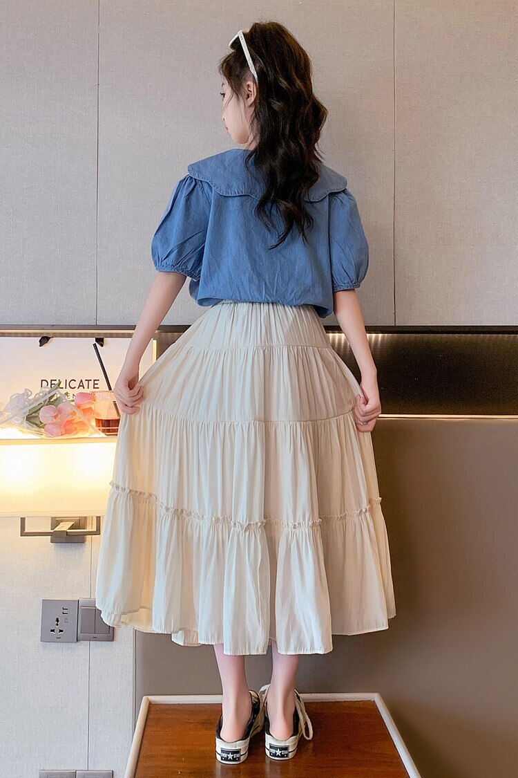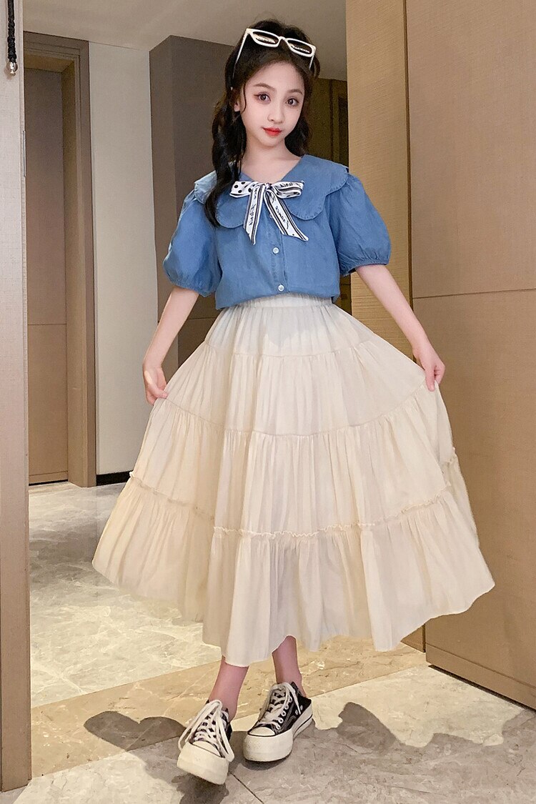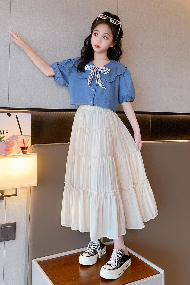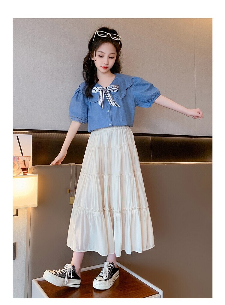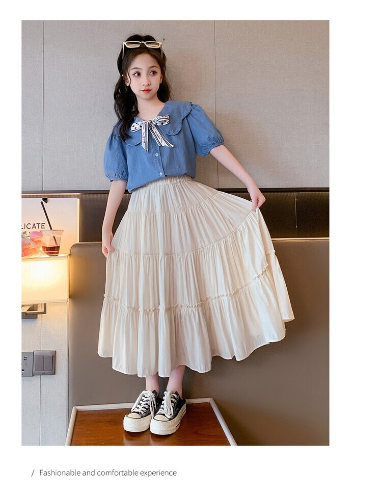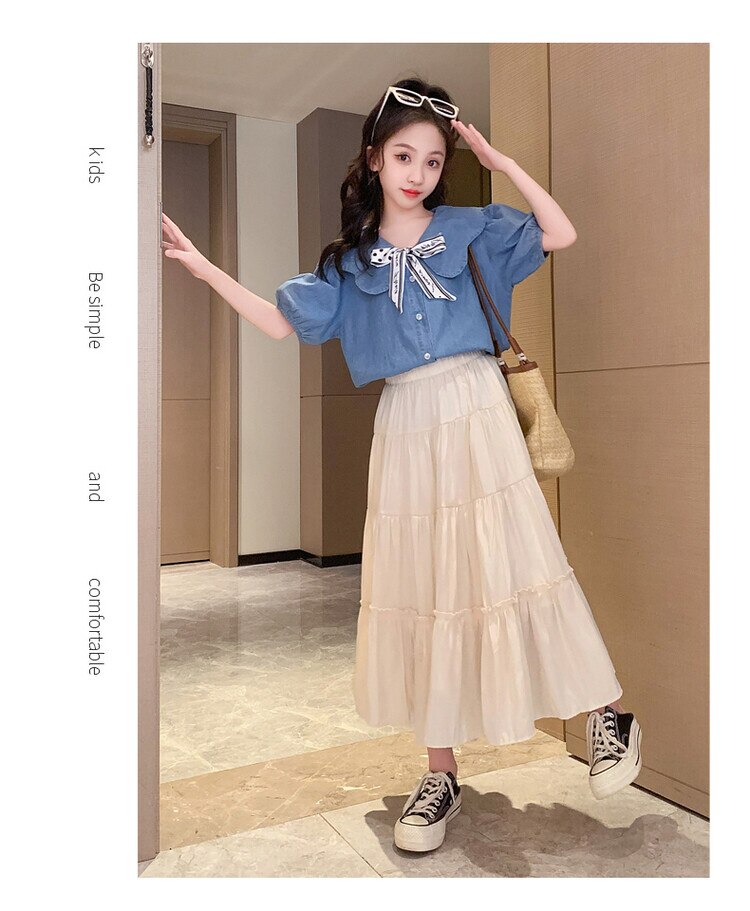 Летняя одежда для девочек, костюм, джинсовая рубашка, юбка в стиле колледжа, повседневный модный костюм свободного кроя, детская одежда для девочек 4-16 лет