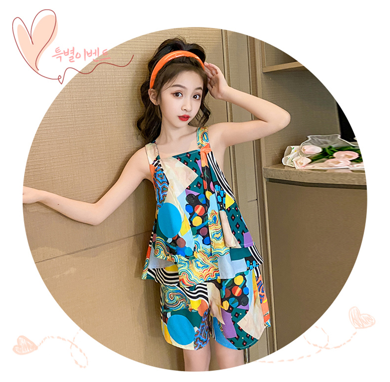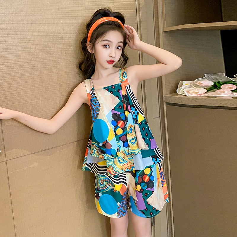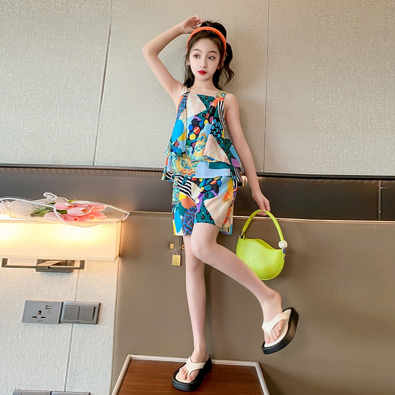 Летняя одежда для девочек, одежда с цветочным узором для девочек, жилет + шорты для девочек, комплект повседневной стильной детской одежды 6, 8, 10, 12, 14