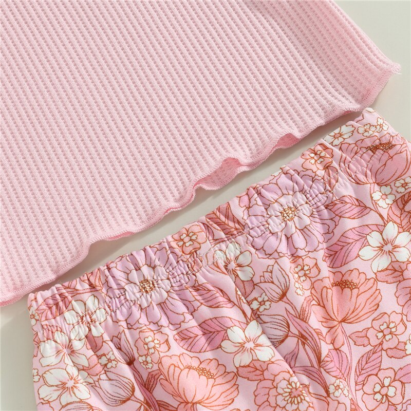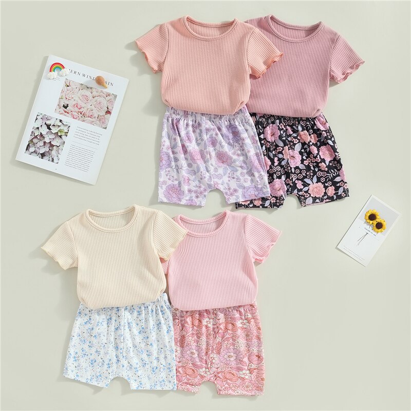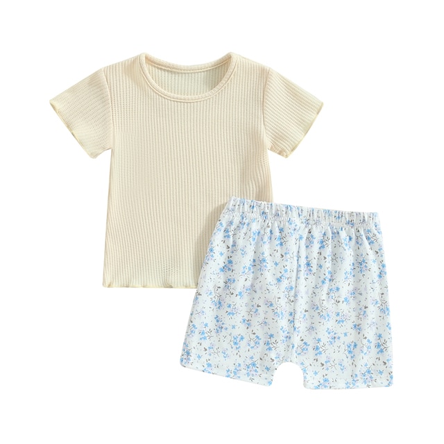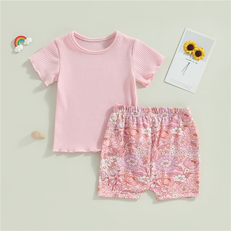 Детский летний комплект из 2 предметов для девочек, Повседневная вафельная футболка с коротким рукавом и эластичные цветочные шорты