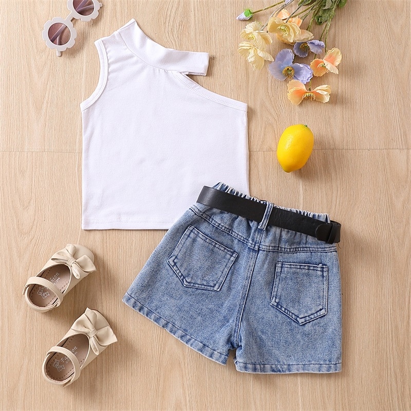 Описание: Летние наряды для маленьких девочек из 2 предметов, асимметричные майки без рукавов + джинсовые шорты с поясом, детская одежда