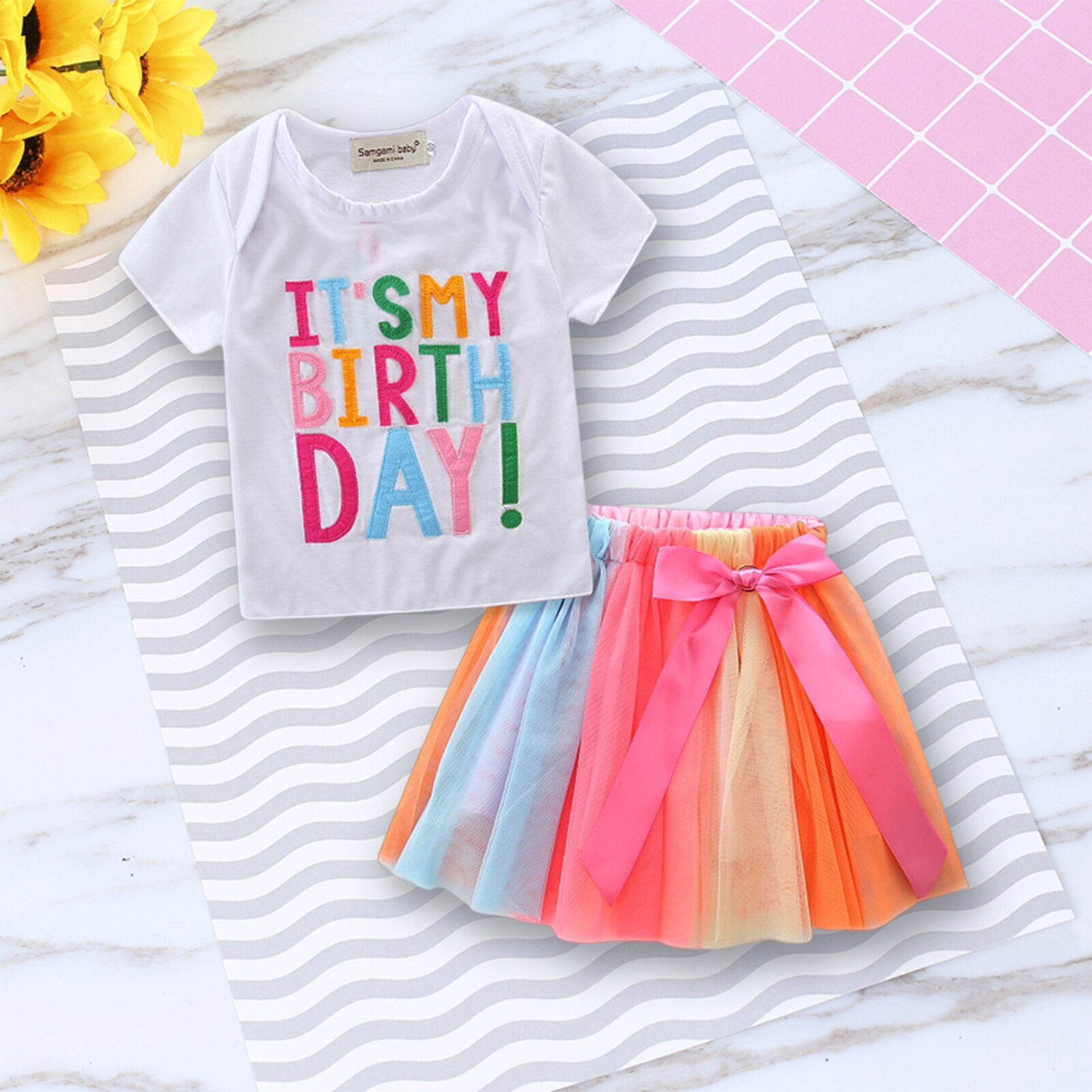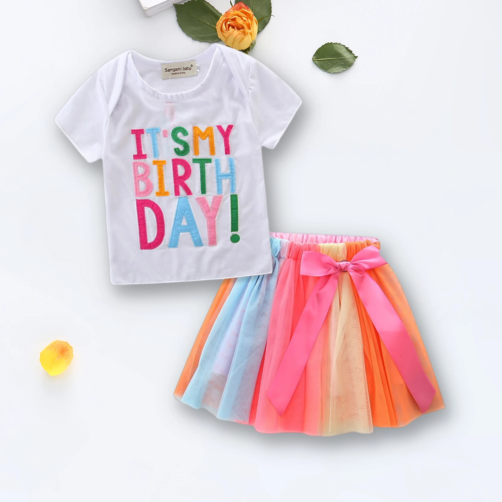 2. Стильный дизайн:В этом наборе есть футболка с буквенным принтом на день рождения в сочетании с красочной сетчатой юбкой, которая модна и мила, делая вашего ребенка более милым и очаровательным.