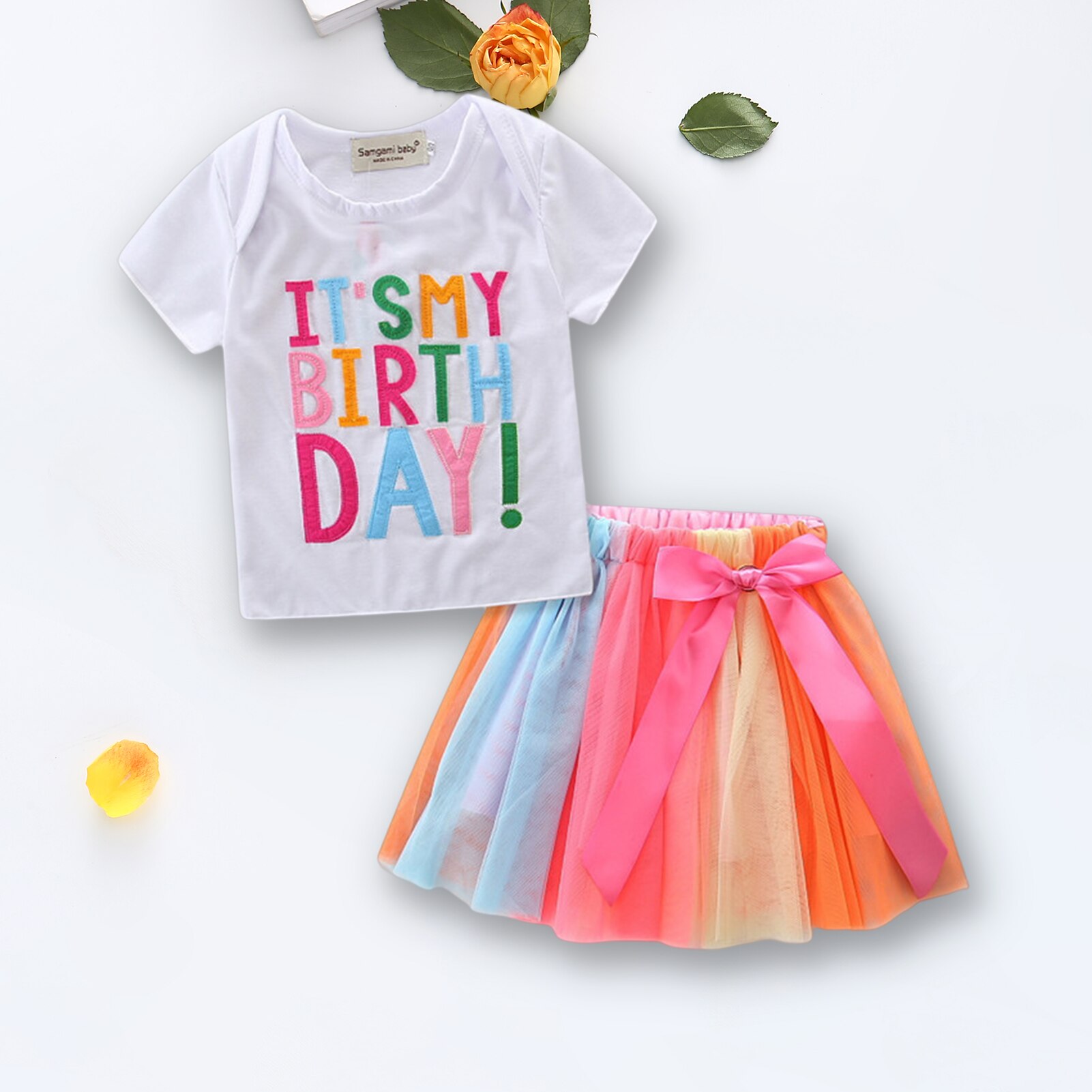 Летняя одежда для маленьких девочек, милая цветная футболка с коротким рукавом + юбка на день рождения + Тюлевая юбка-пачка, повседневная одежда для детей