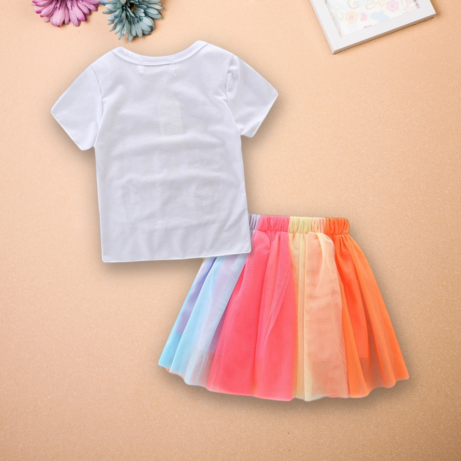 1. высококачественный материал:Этот комплект из футболки и юбки, изготовленный из смесовой хлопчатобумажной ткани, мягкий, дышащий и удобный в носке, что гарантирует хороший уход за нежной кожей вашего ребенка.