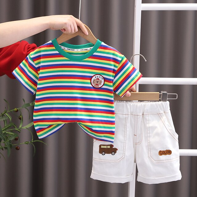 Летняя одежда для малышей, для мальчиков, для маленьких мальчиков, мультяшный, полосатый, с коротким рукавом, 2 шт., повседневный комплект, детский, с милым принтом автомобиля, повседневная одежда, одежда