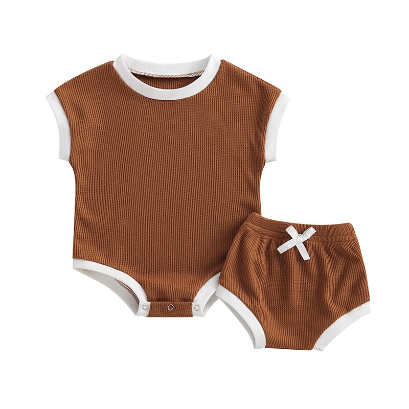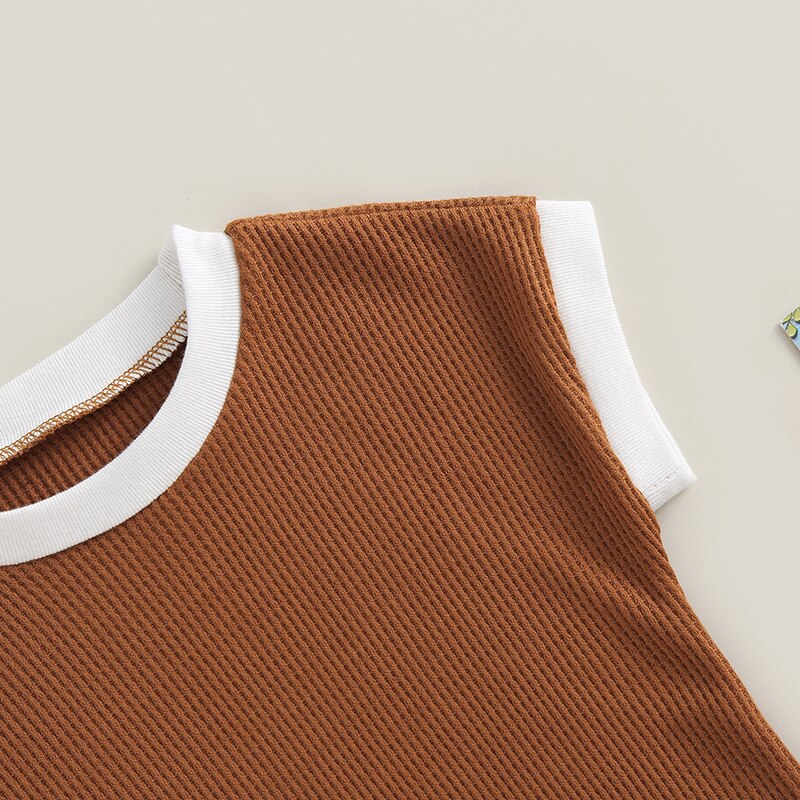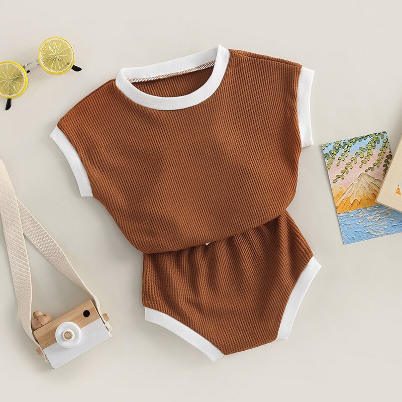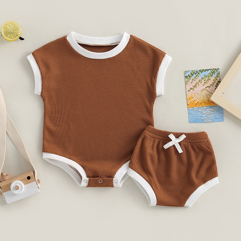 Описание: Летняя одежда для маленьких мальчиков Комбинезон контрастного цвета с коротким рукавом и эластичные повседневные шорты Комплект нарядов