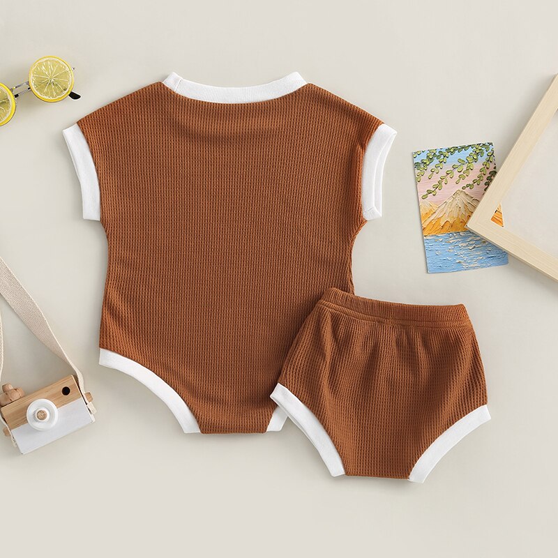 Контрастный цвет, круглый вырез, Летний комбинезон с короткими рукавами для мальчика и повседневными шортами с эластичной талией, который сделает вашего маленького мальчика более привлекательным среди его сверстников.