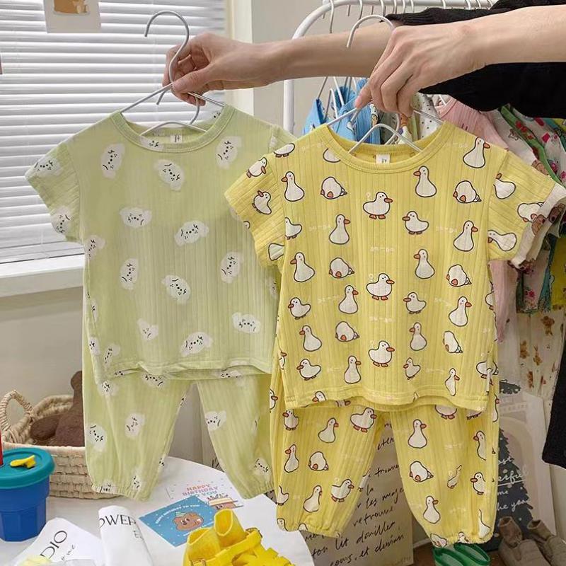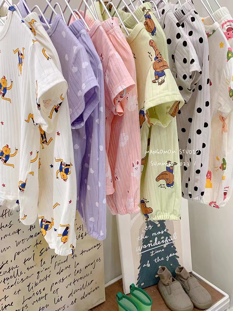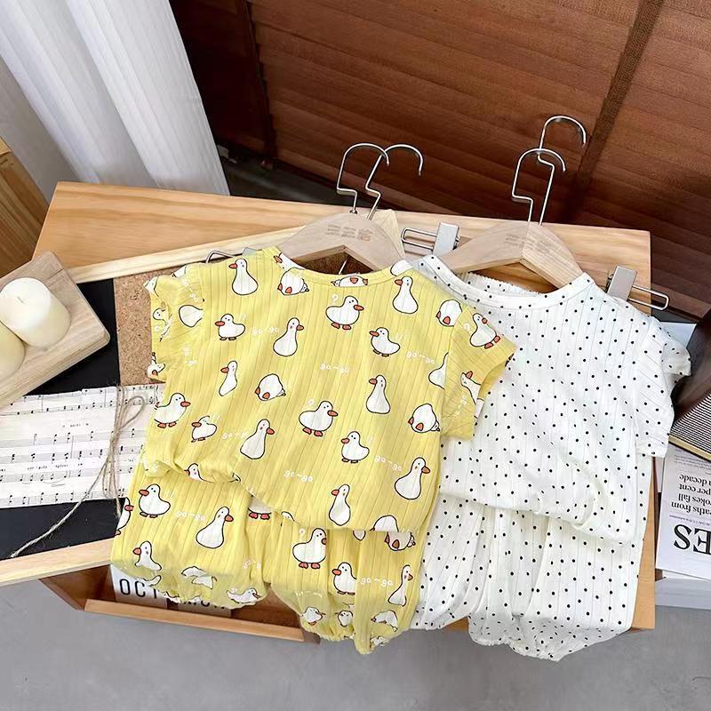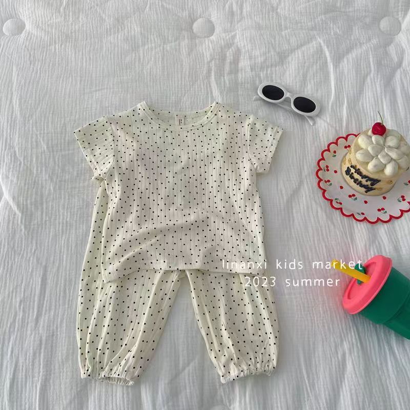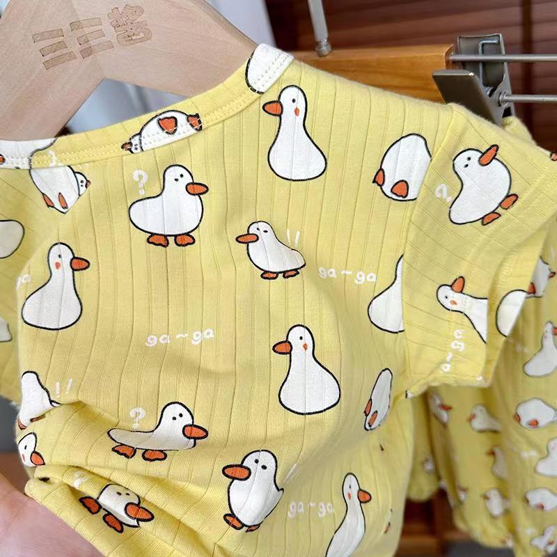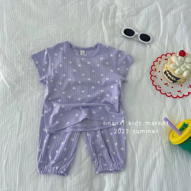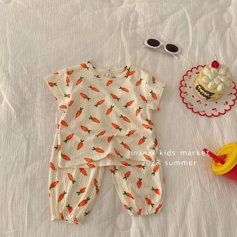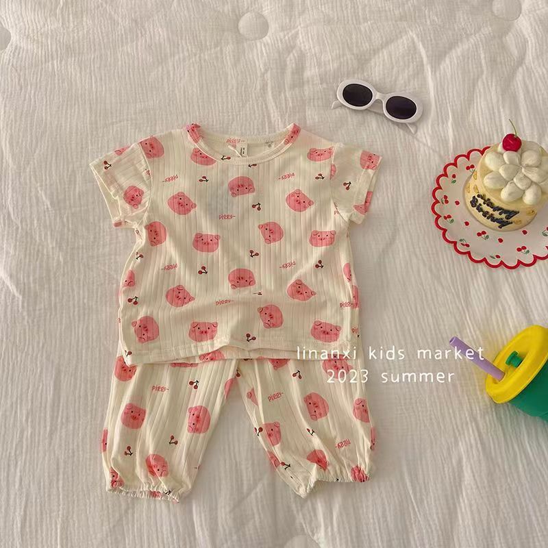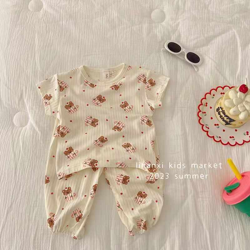 Летняя одежда для сна для девочек, милый модный топ с круглым вырезом и принтом, повседневные свободные штаны, брендовые мультяшные костюмы для 1, 2, 3, 4 лет
