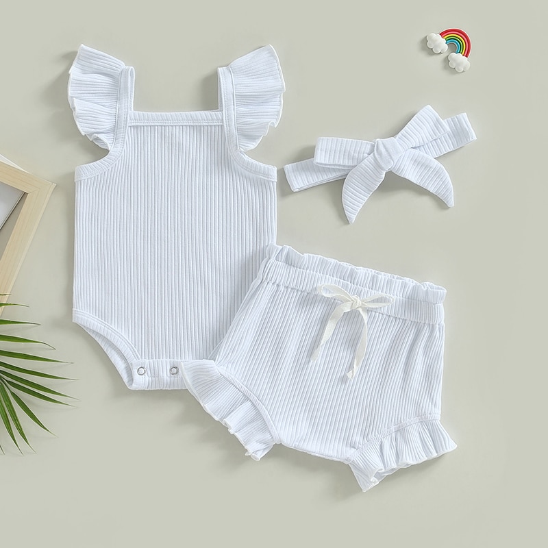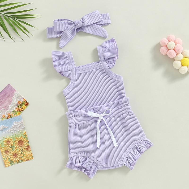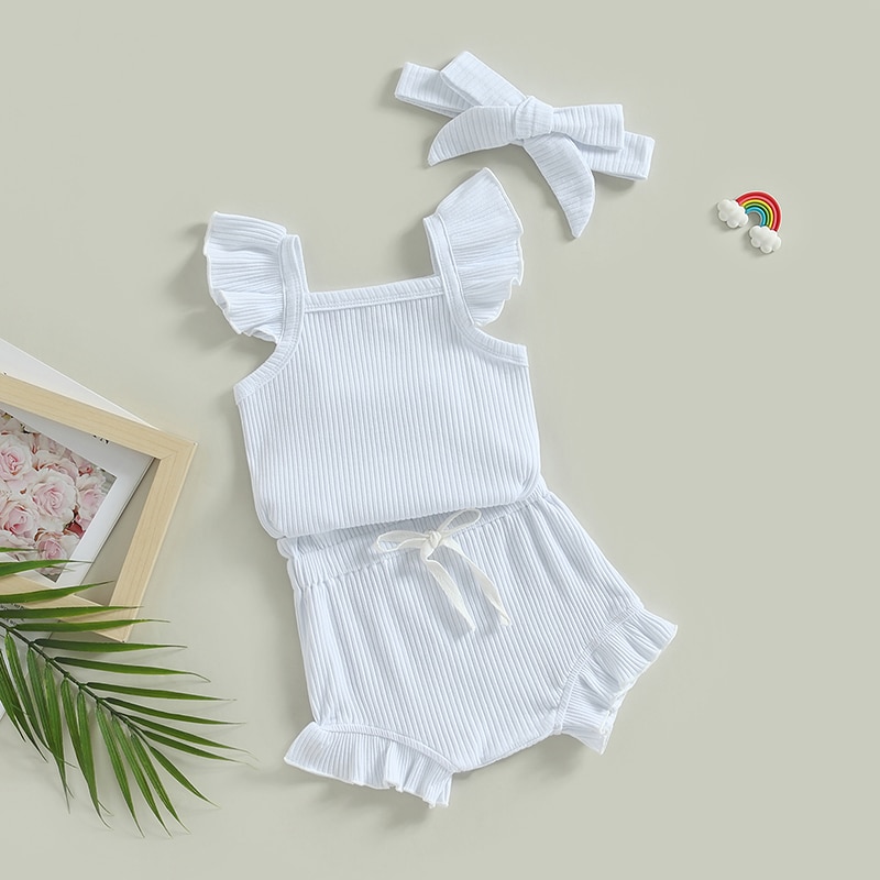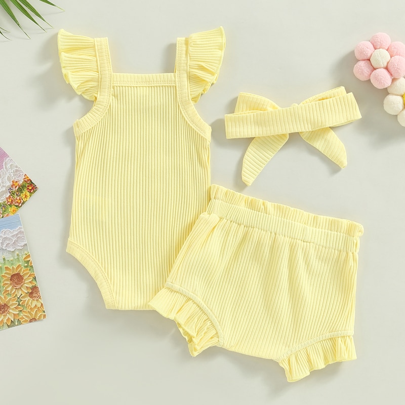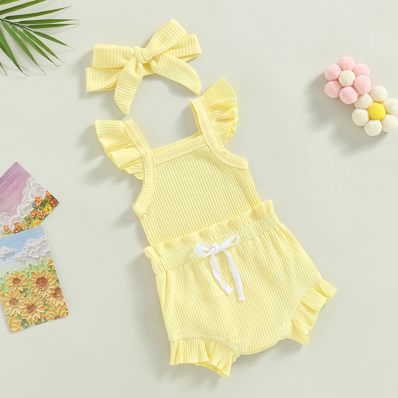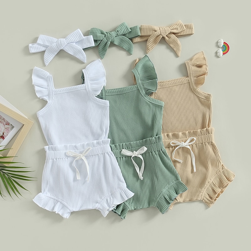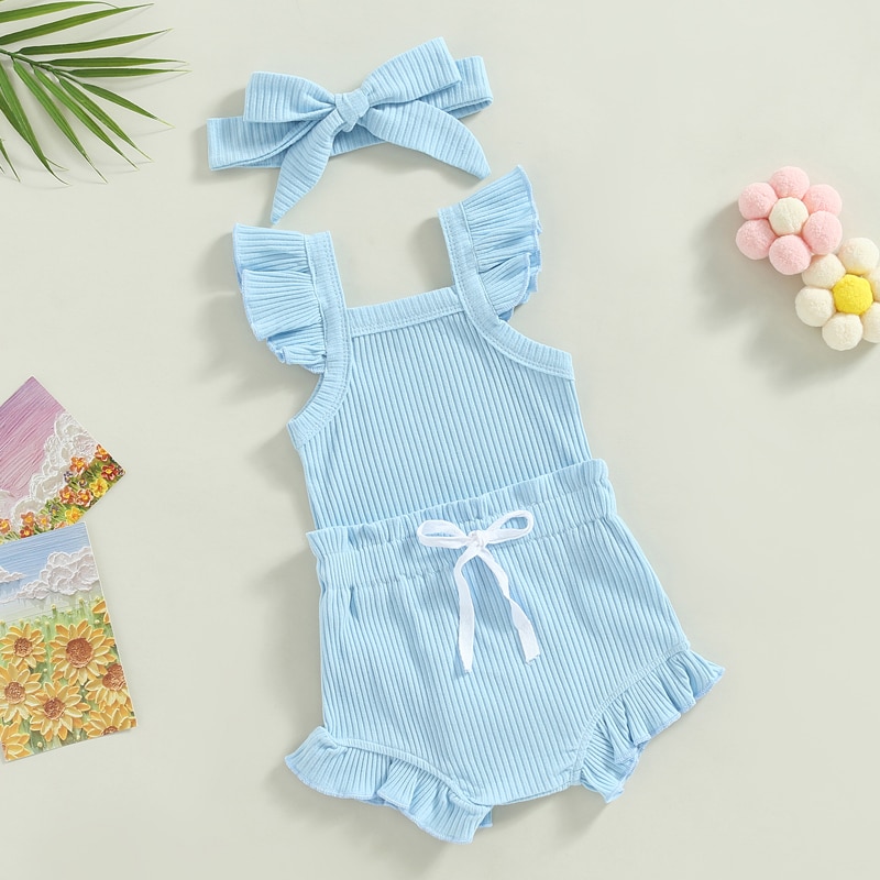 Описание: Одежда для маленьких девочек, однотонный комбинезон с рукавами-мушками, топы, Короткие штаны на шнурке, повязка на голову, повседневная одежда