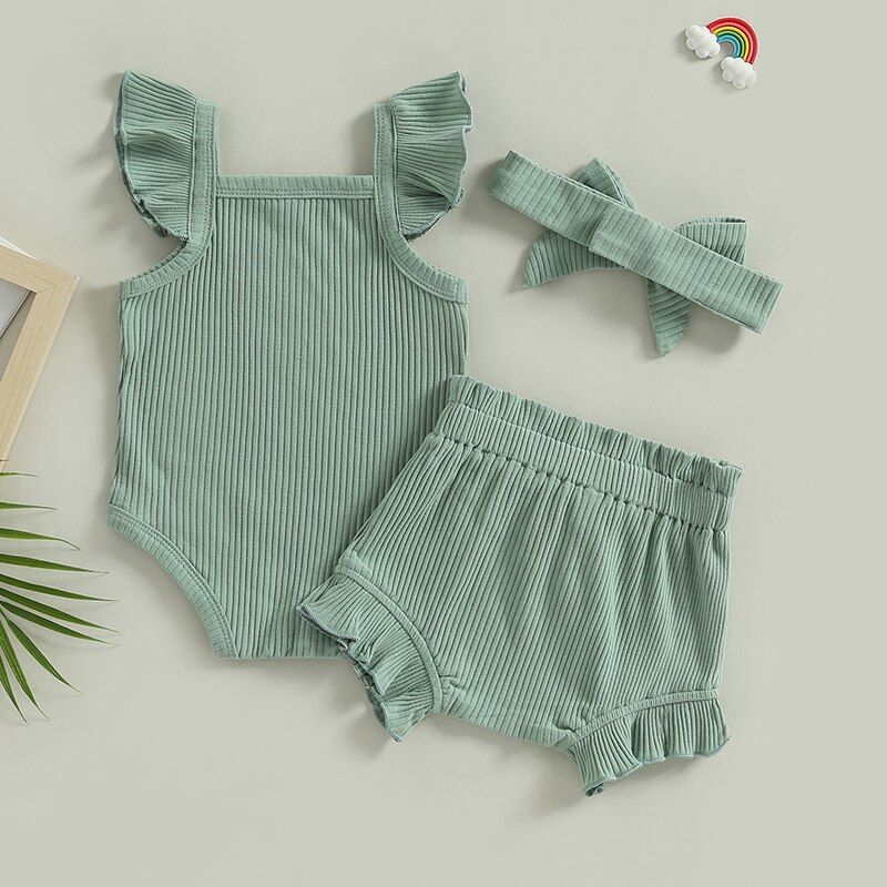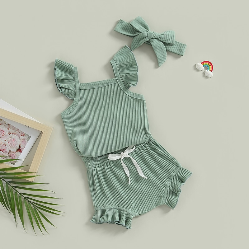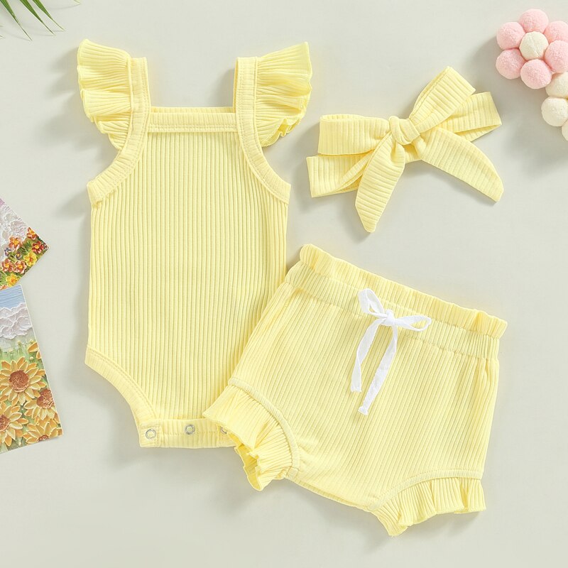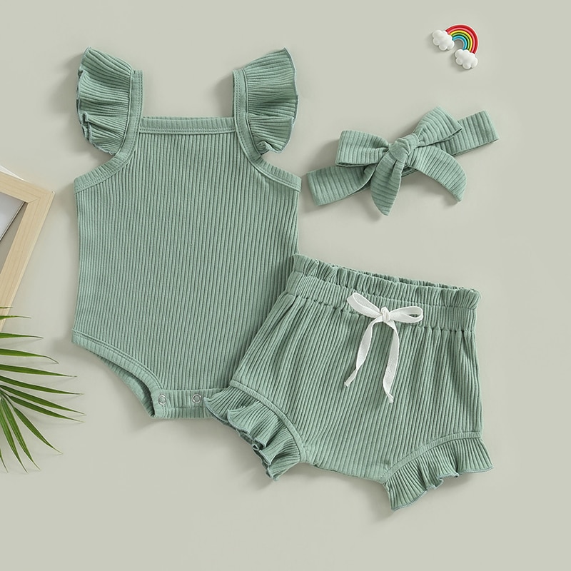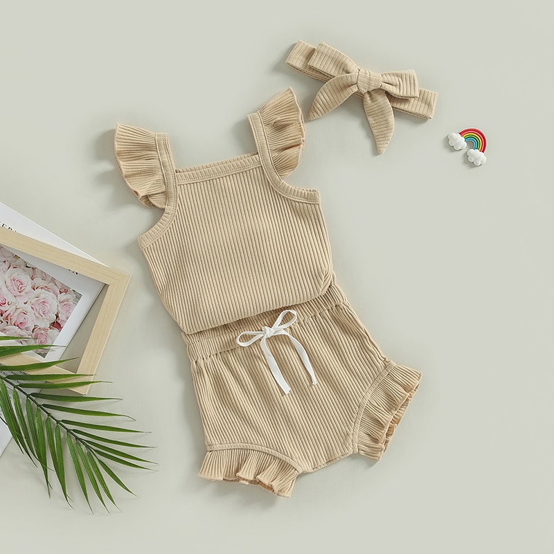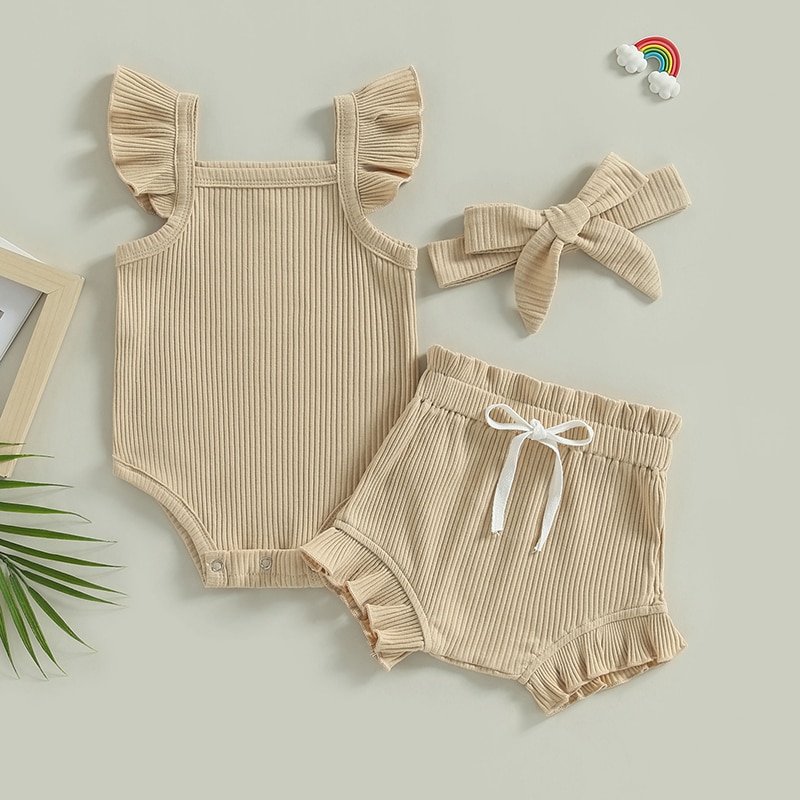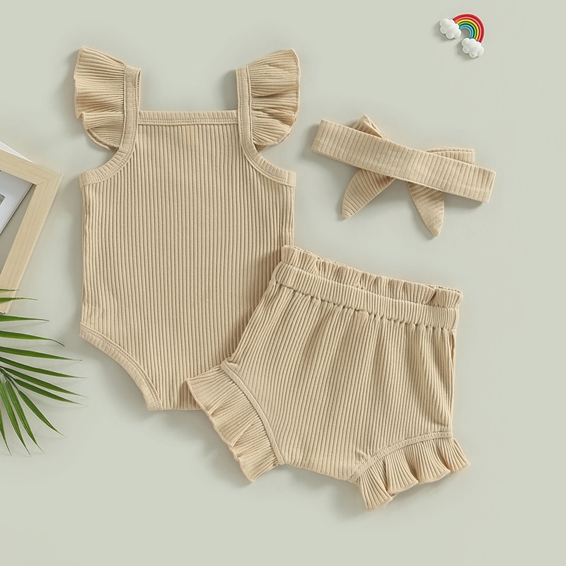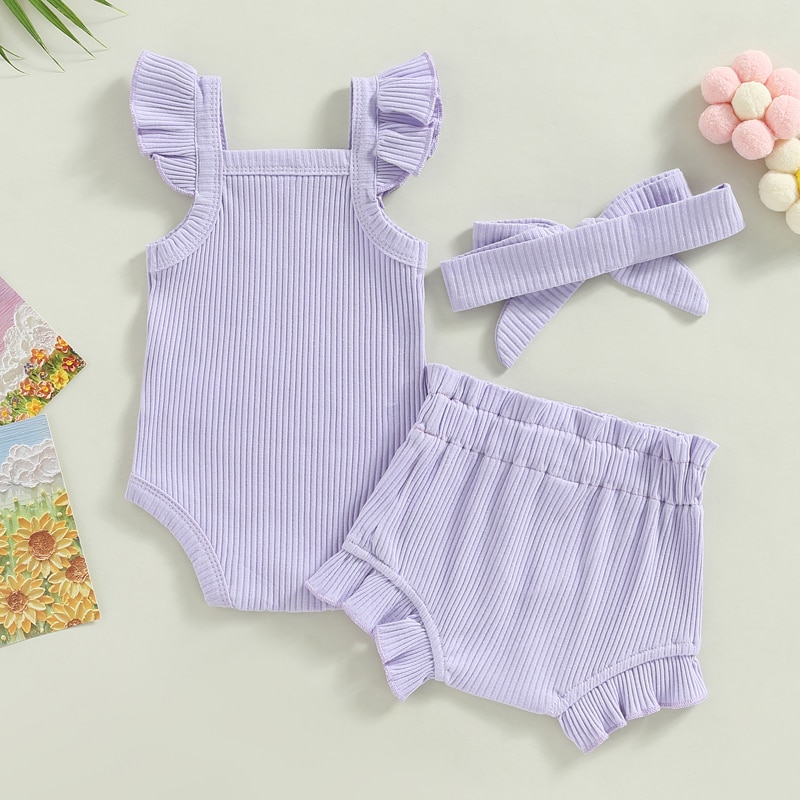 Описание: Одежда для маленьких девочек, однотонный комбинезон с рукавами-мушками, топы, Короткие штаны на шнурке, повязка на голову, повседневная одежда