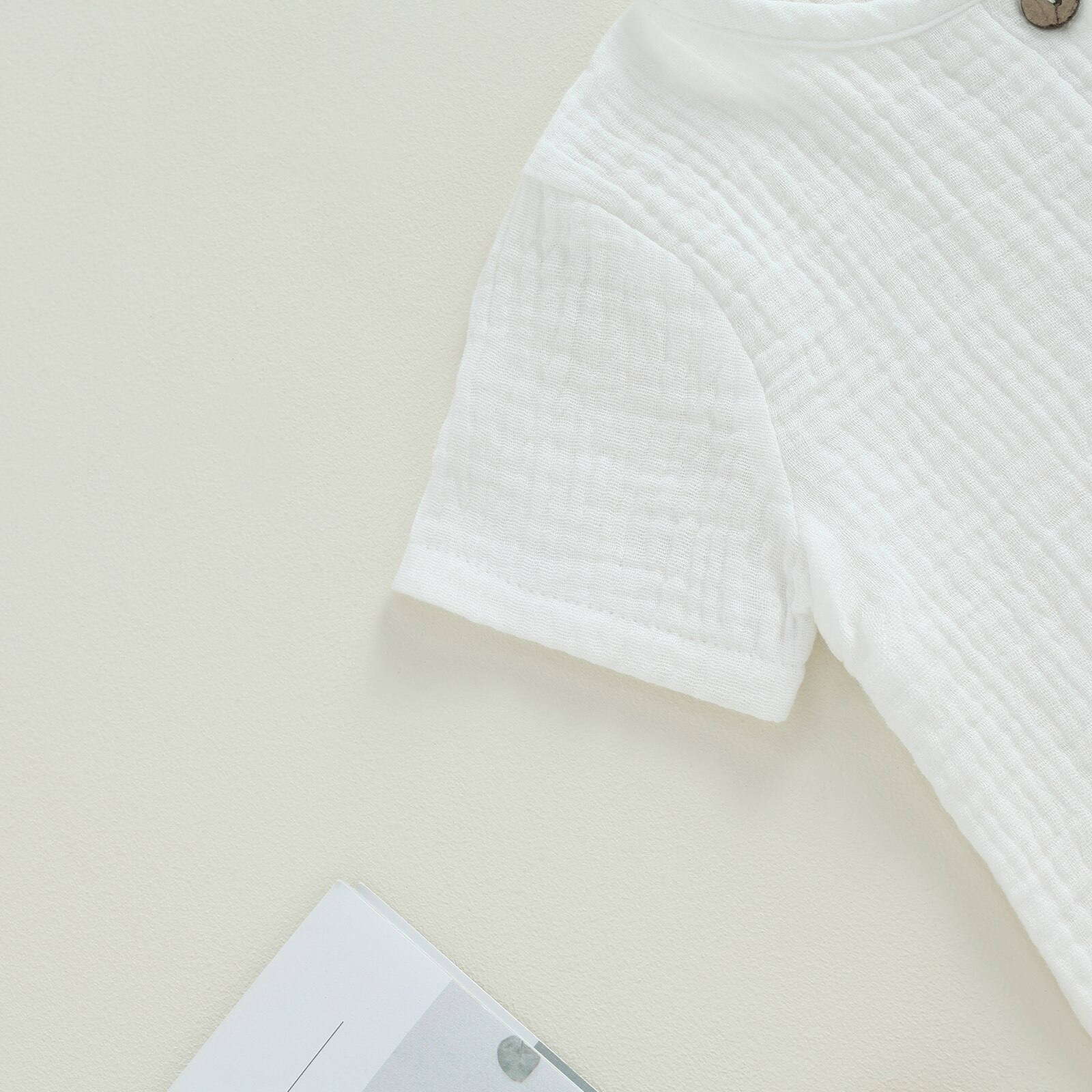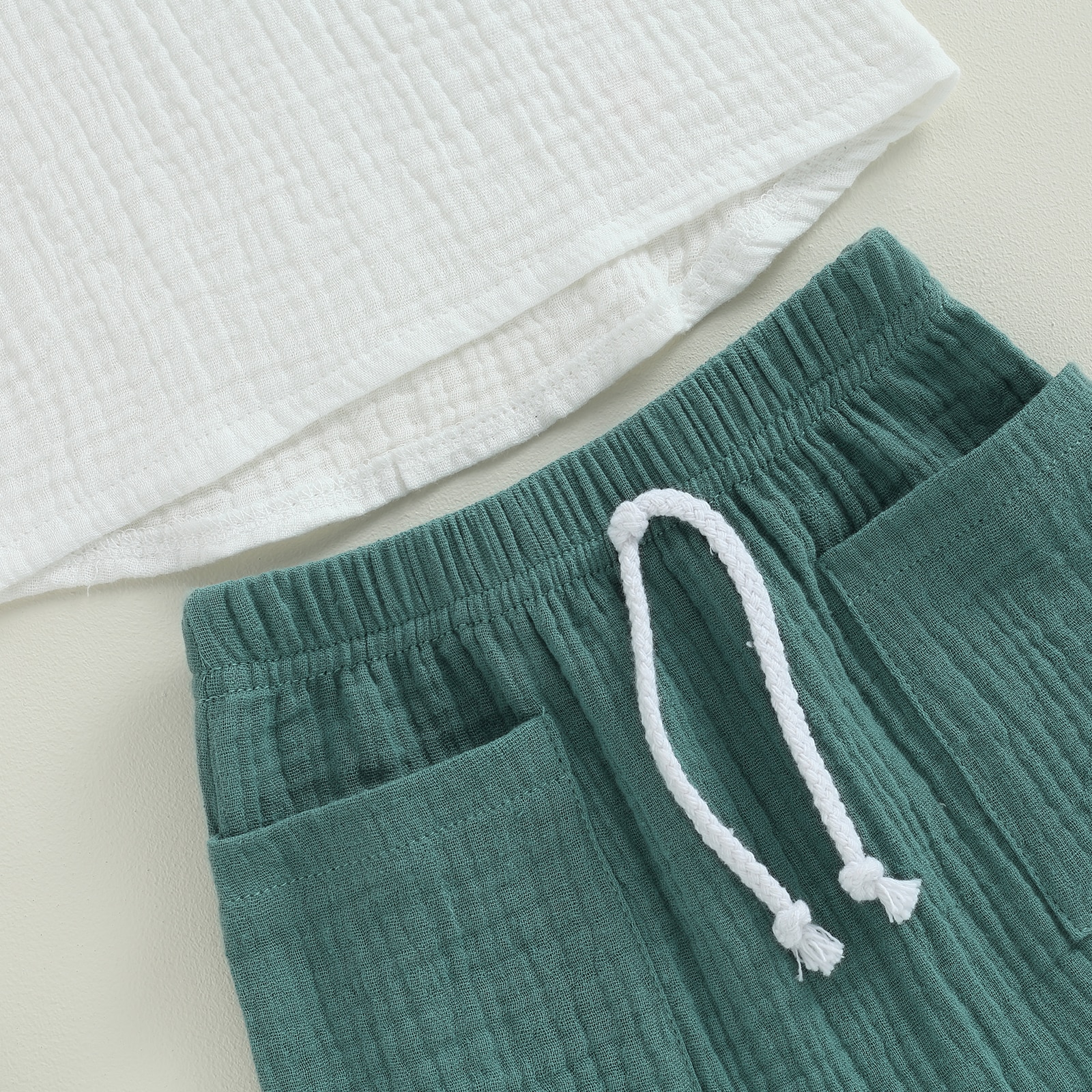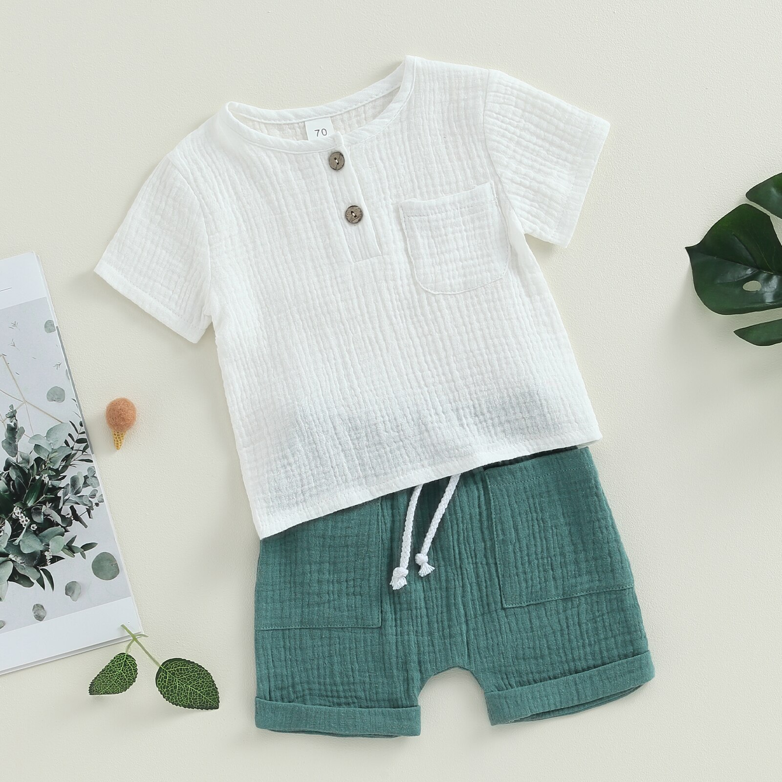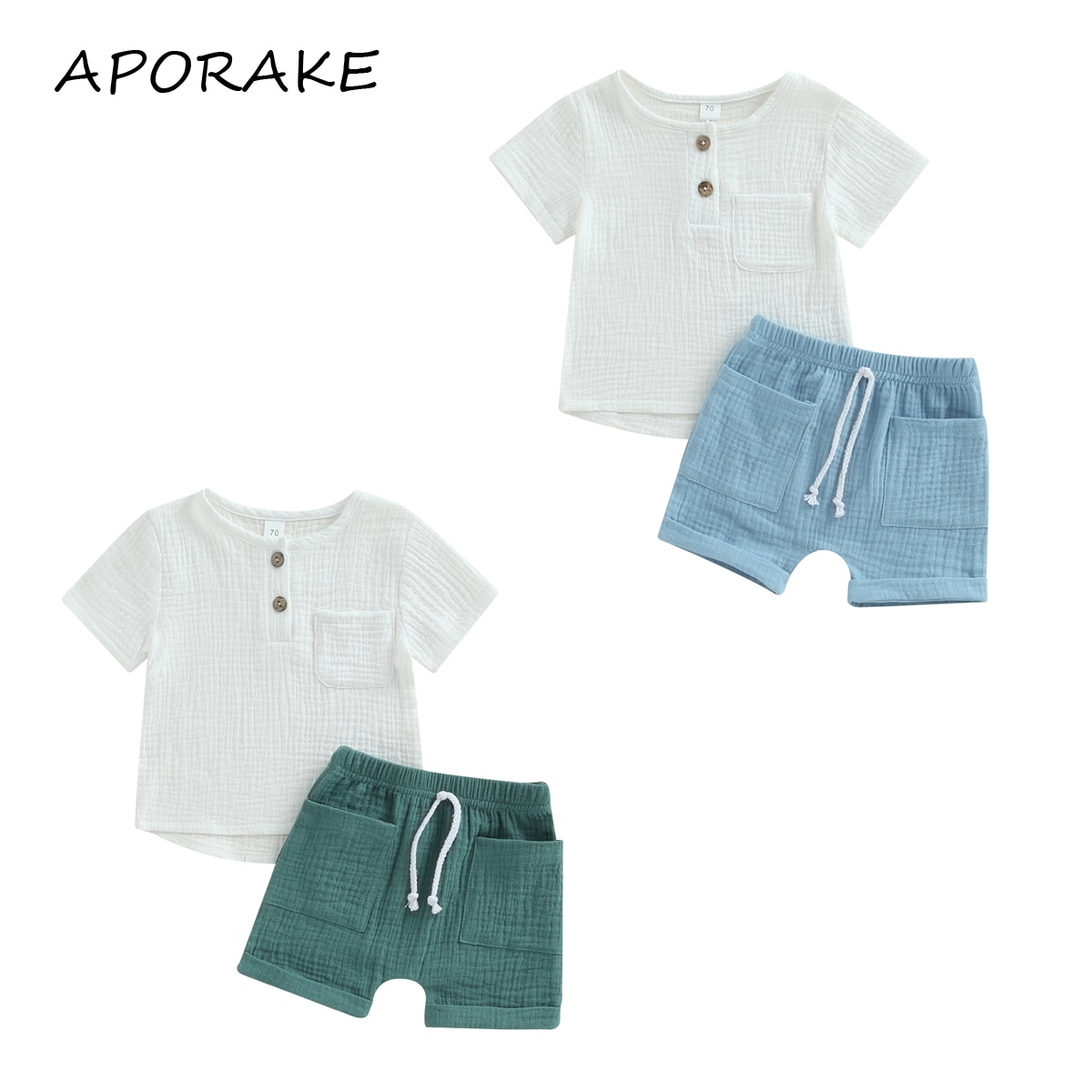 Летняя повседневная одежда для маленьких мальчиков 2023, топ с коротким рукавом и пуговицами на карманах + шорты, летняя хлопковая льняная одежда для малышей