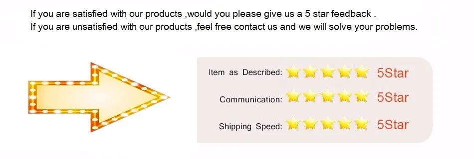 5. Если вам нравится наш продукт, пожалуйста, дайте нам пять звезд отзывы. Если у вас есть какие-либо проблемы с продуктом, пожалуйста, свяжитесь с нашей службой поддержки немедленно, прежде чем открывать спор или оставлять плохие отзывы. Спасибо. Мы сделаем все возможное, чтобы служить вам и защищать ваше право.