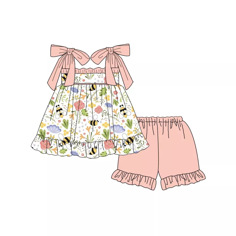 Лидер продаж одежда для маленьких девочек Летняя пчела цветы жемчужная туника с рюшами шорты наборы Бутик Одежда для маленьких девочек детская одежда