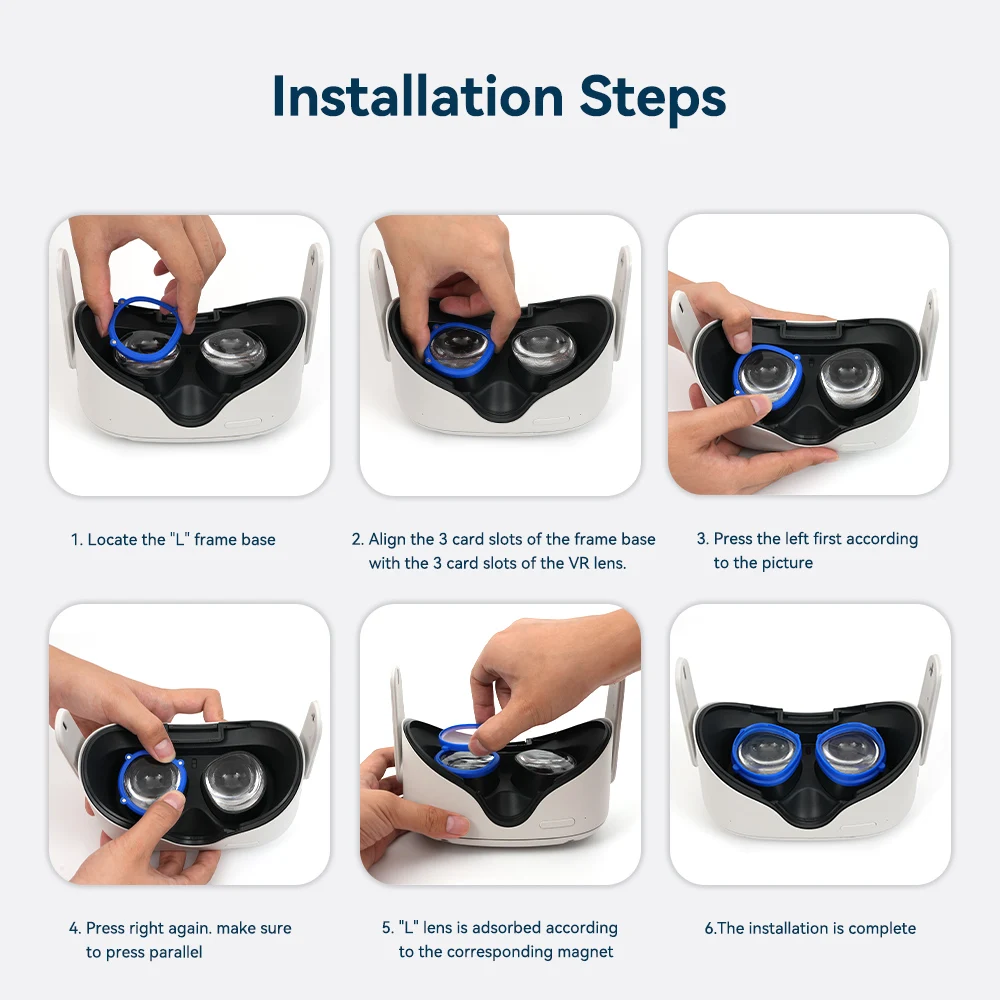 * Быстрая установка: конструкция рецептурных линз обеспечивает быструю установку, которую можно выполнить менее чем за 5 секунд. Изделие поставляется с магнитным креплением и магнитными линзами. Сначала Наденьте крепление на объектив гарнитуры, затем Просто наденьте линзы на магнитное крепление, тогда линзы надежно останутся на креплении. Разделяя гарнитуру с друзьями и семьей, просто снимите линзы с легкостью, и гарнитура Oculus не отпускается по рецепту.