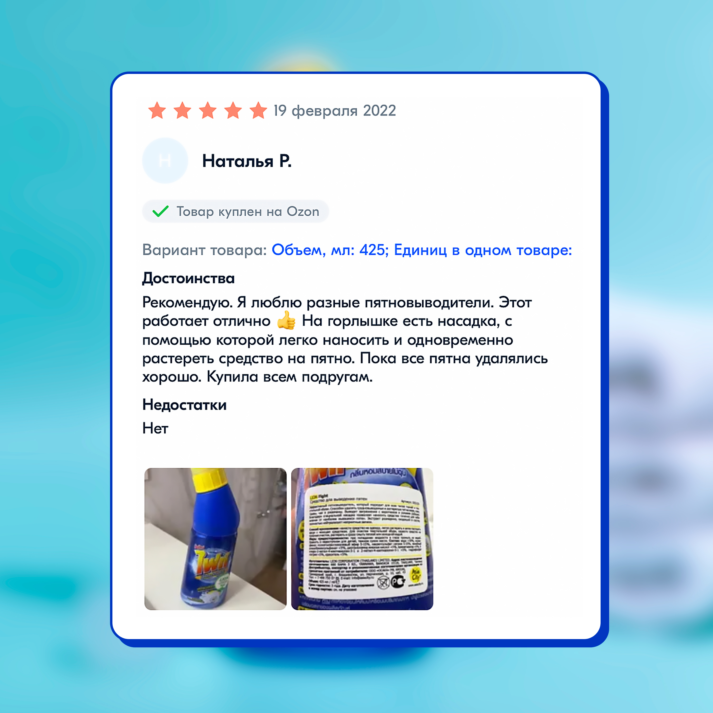 Специальная насадка позволяет точечно наносить средство для удаления наиболее въевшихся пятен. Особенно эффективен для очищения воротников и рукавов рубашек.