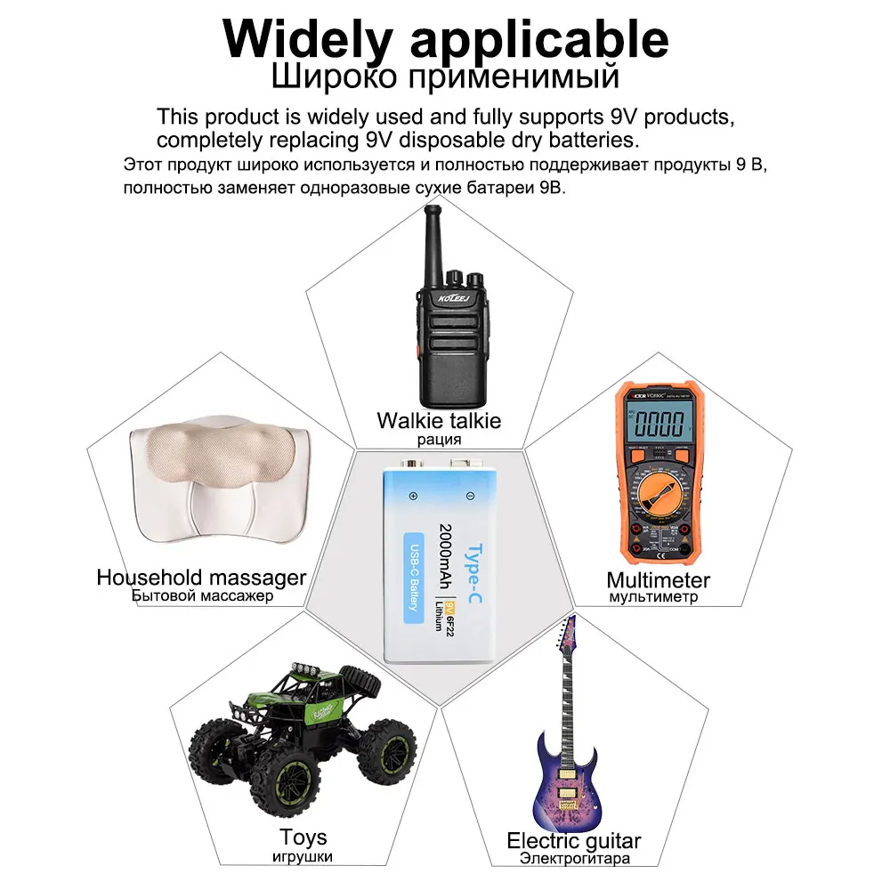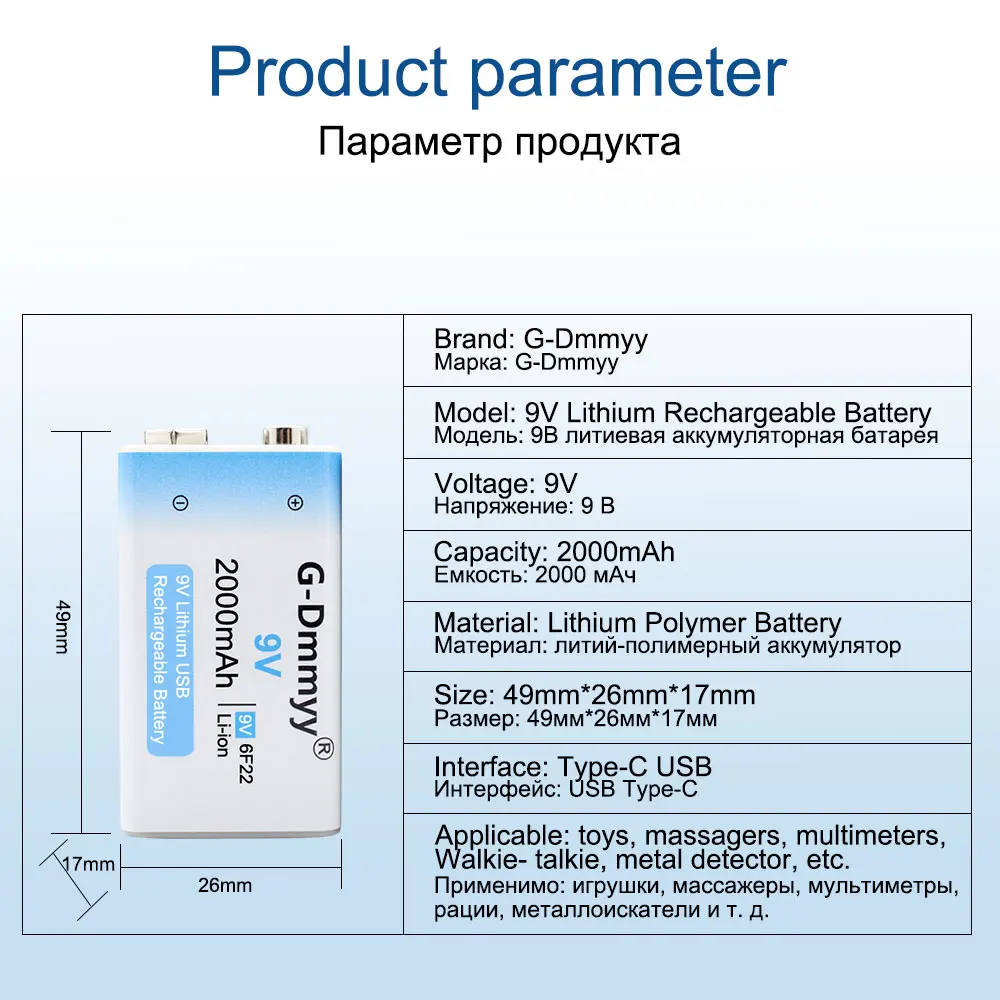 Размер: литиевая аккумуляторная батарея USB 9 В