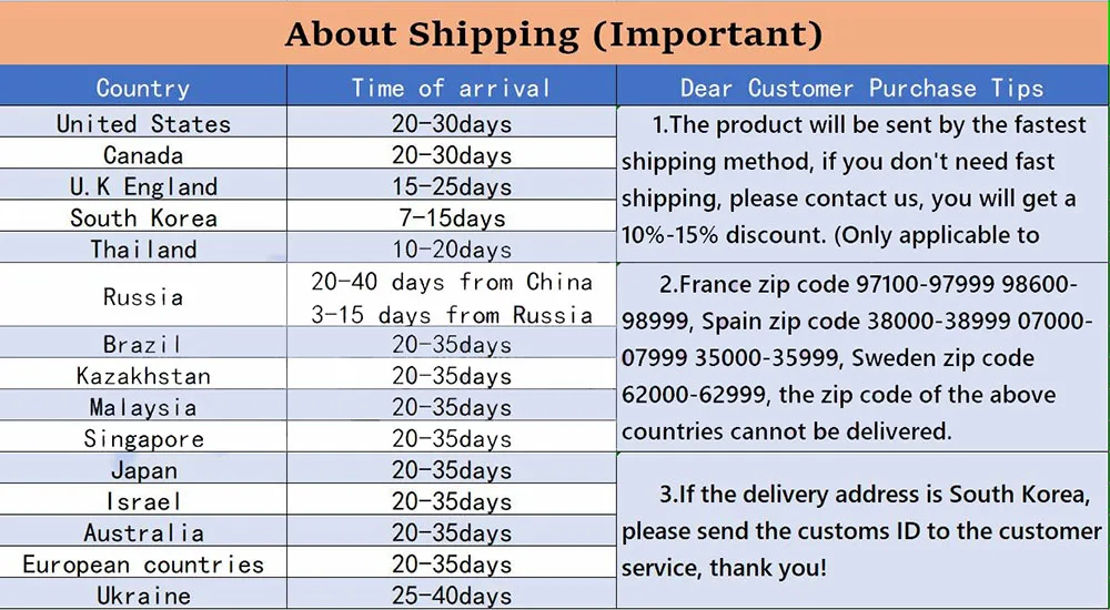 한국 세관의 요구 사항으로 인해 모든 한국 구매자는 개인 세관 코드를 제공해야합니다. 주문시 비고란에 개인 통관 코드를 작성하십시오. 협조 해 주셔서 감사합니다!