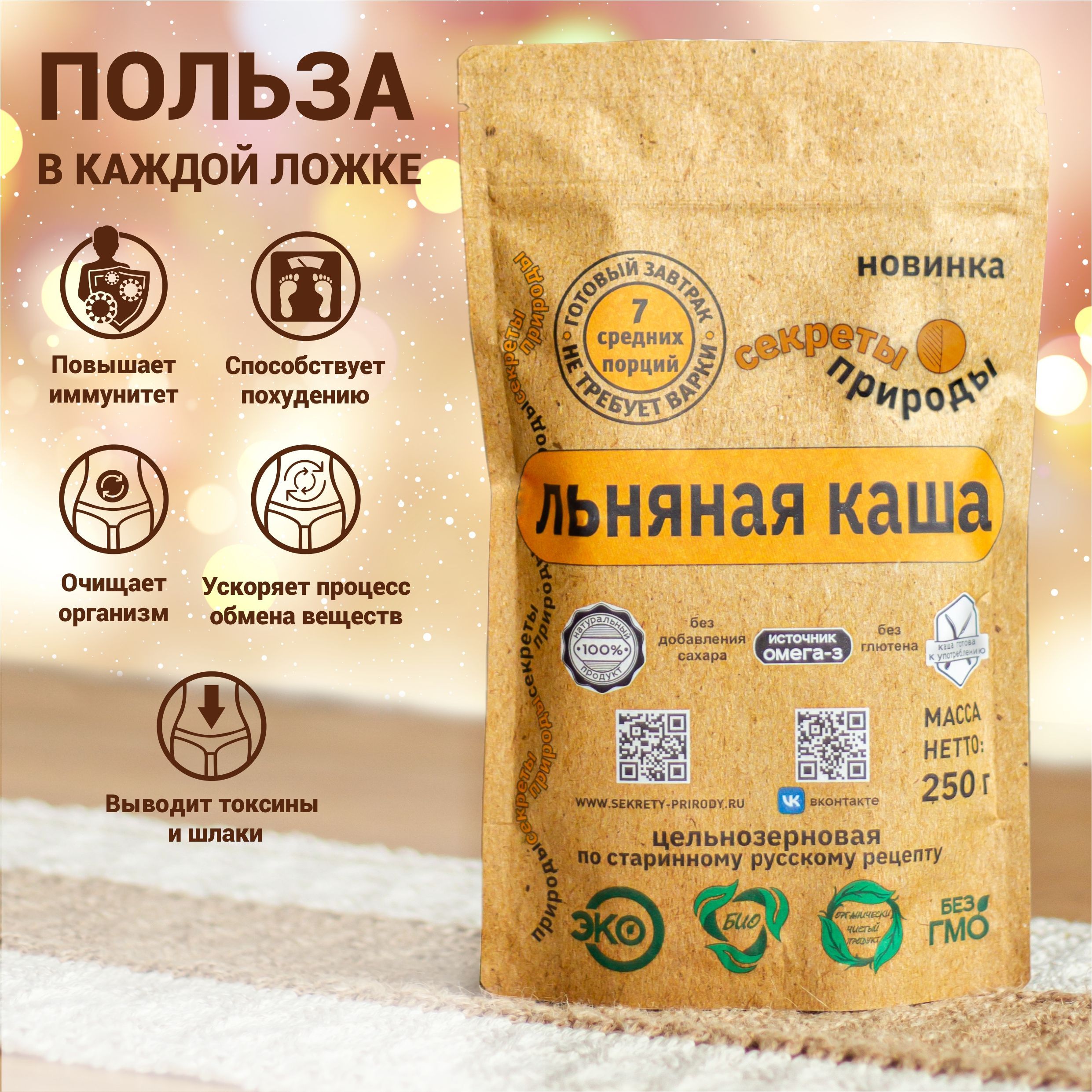 Описание: Цельнозерновая льняная каша быстрого приготовления!?Льняная каша «Секреты природы» производится из перемолотых семян темного льна по старинному русскому рецепту!