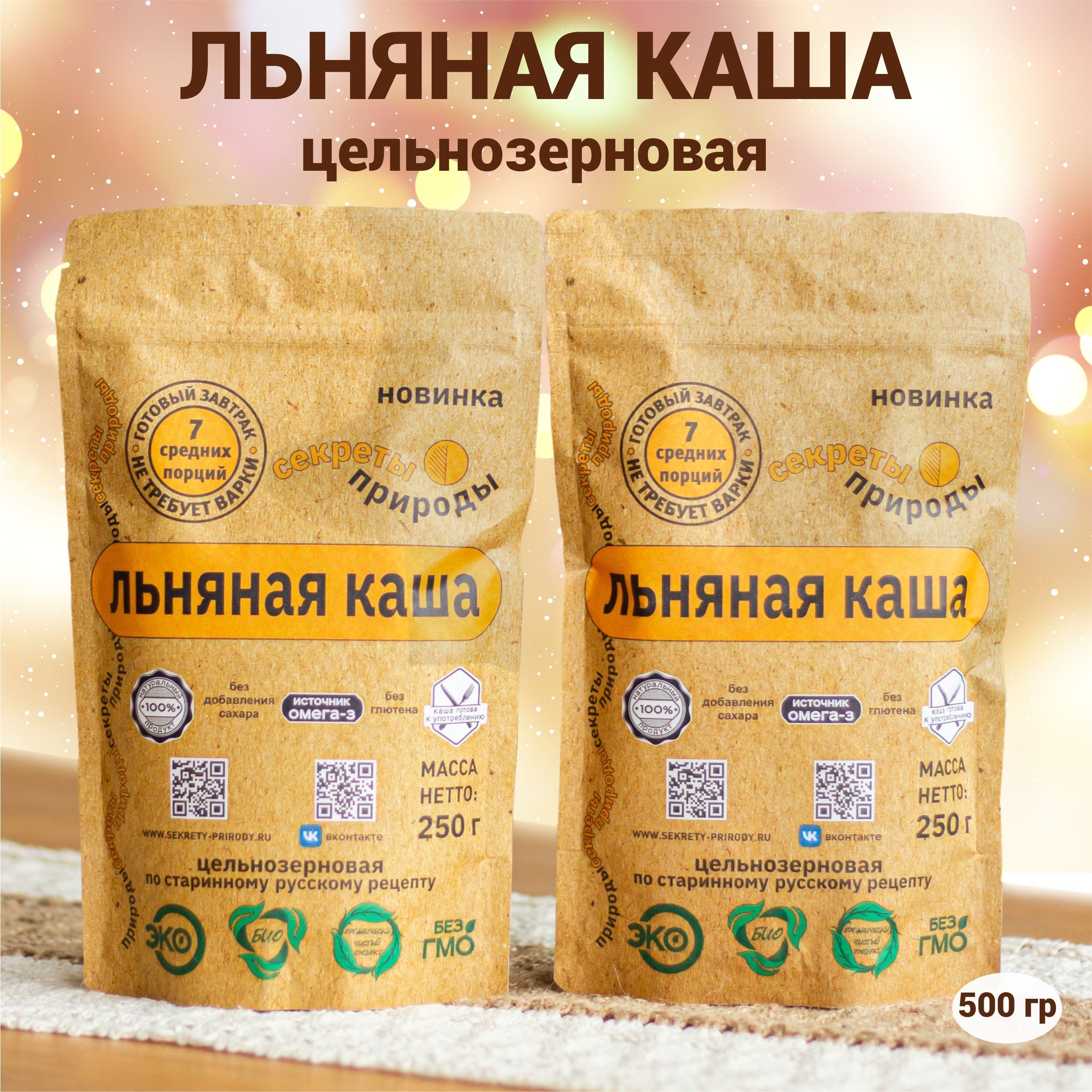 Льняная каша 500 г / Цельнозерновая каша быстрого приготовления Секреты Природы (2 пакета по 250 г) / Без глютена!