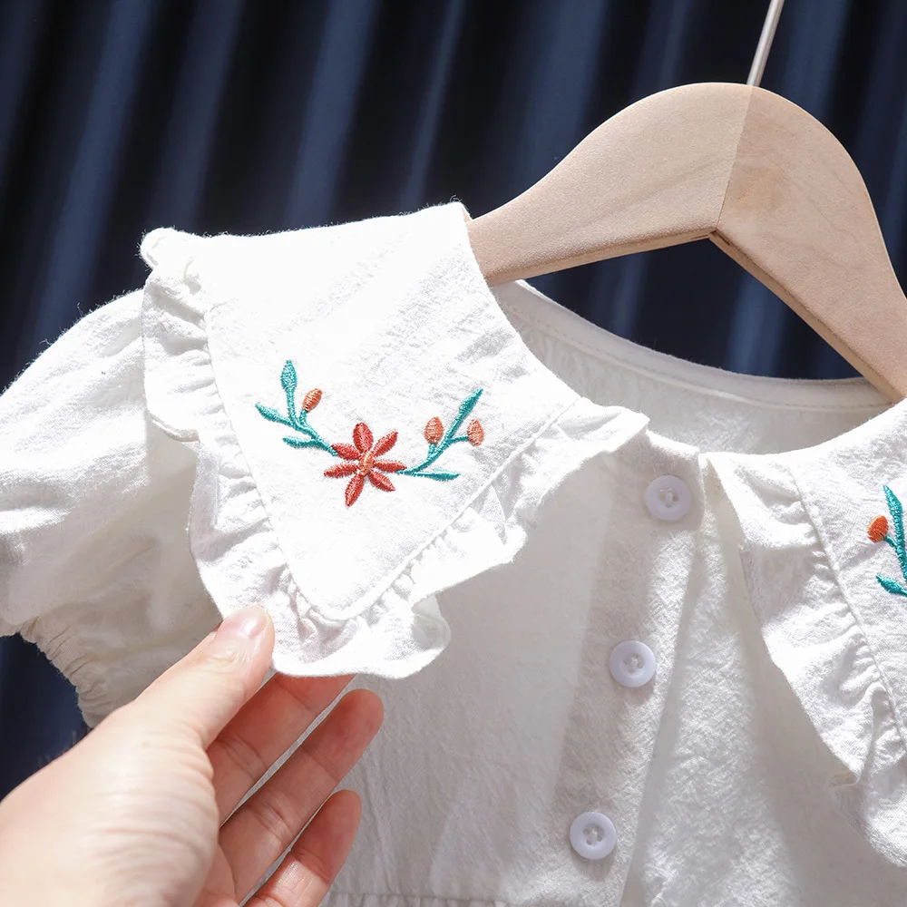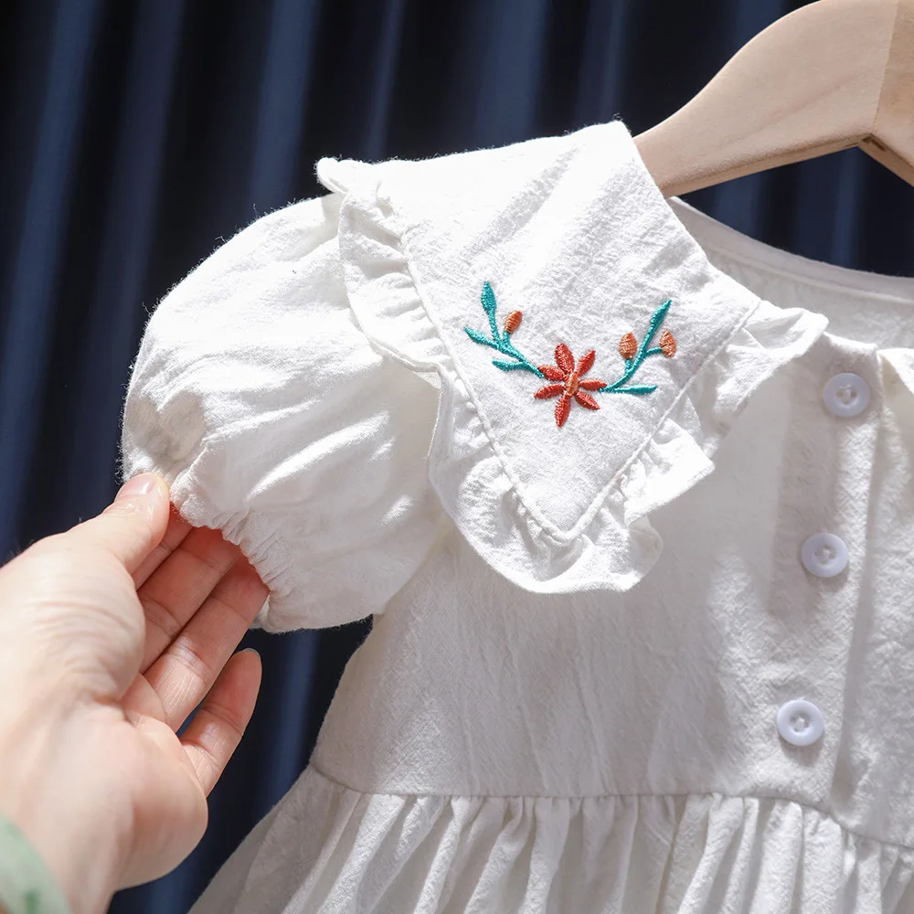Льняное платье для девочек с цветочной вышивкой и кукольным воротником