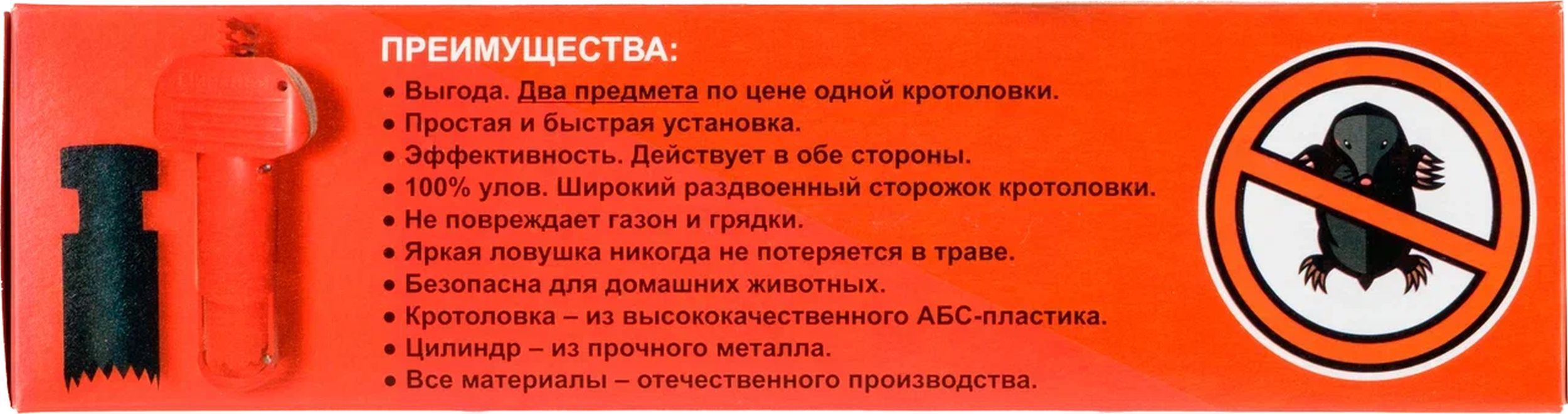 Преимущества1. 100% улов. Сторожок (раздвоенный язычок) не позволит кроту, землеройке или мыши-полевке проскочить капкан, не зацепив спусковой механизм.