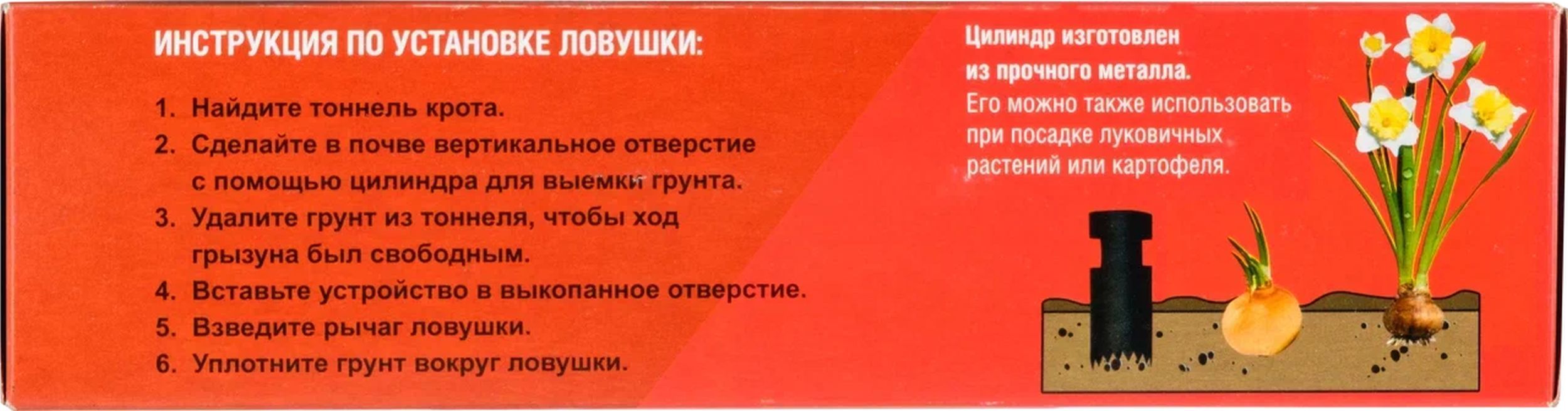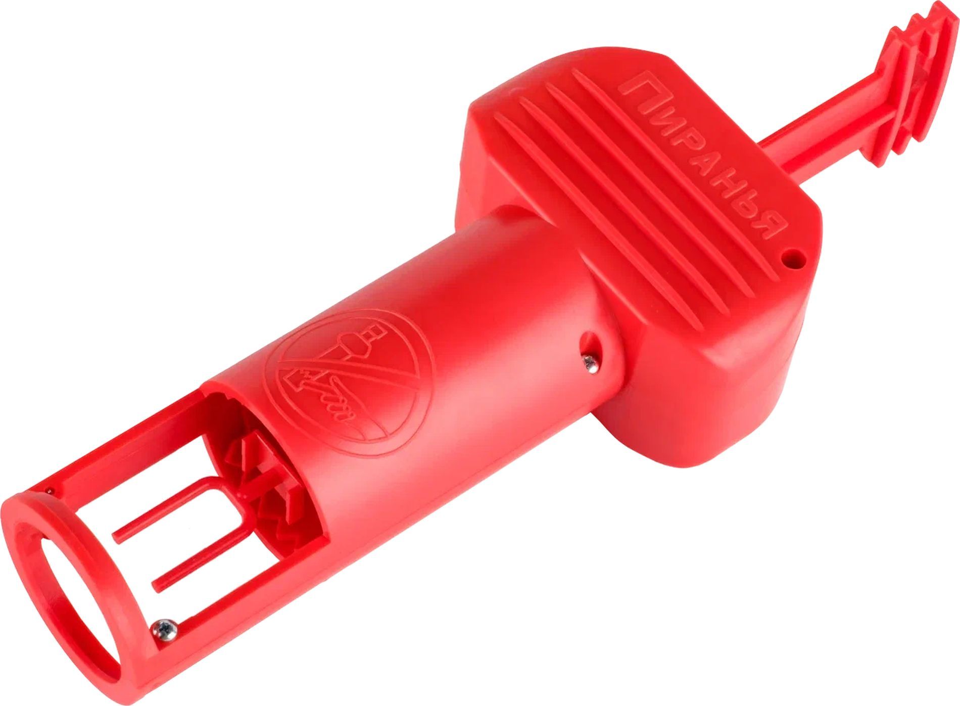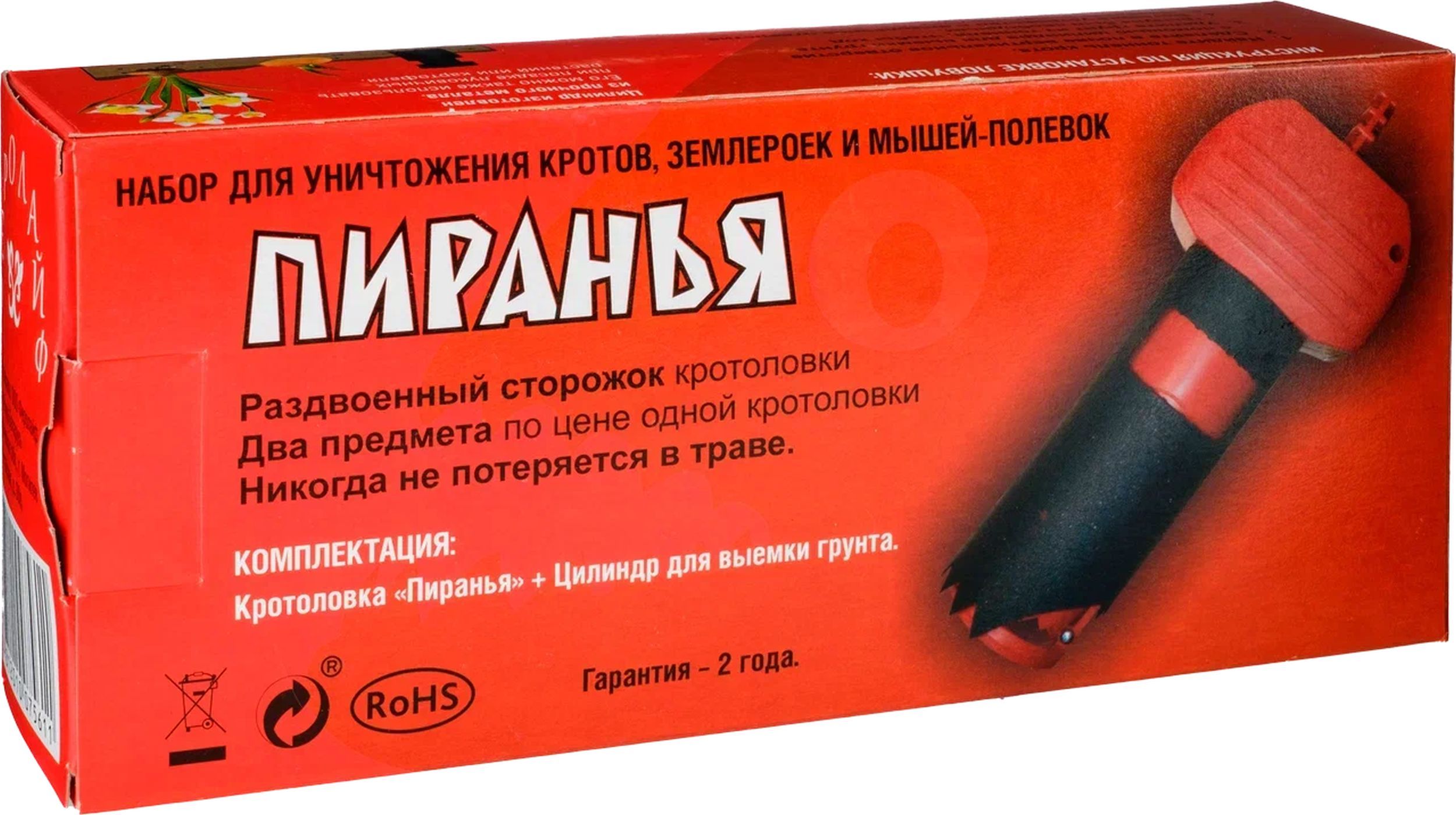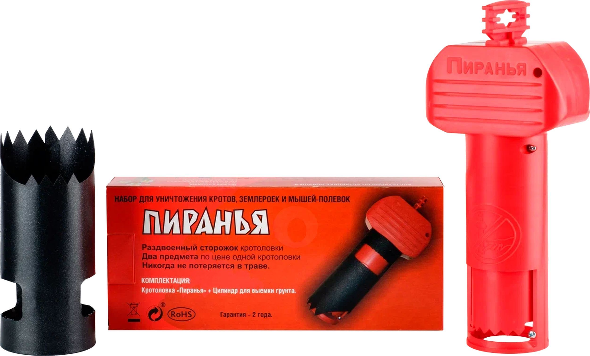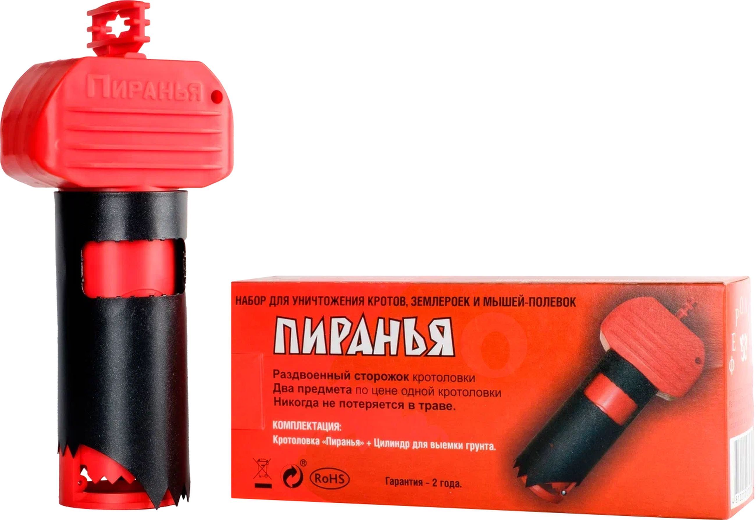 Описание: ловушка кротов, землероек, мышейПиранья - ловушка кротовКротоловка капкан Красная Пиранья. Комплект (2 в 1). Полный набор для ловли подземных грызунов.  ОписаниеВ комплекте Пиранья – не только пластиковая ловушка, но и дополнительный аксессуар – уникальный металлический цилиндр со скошенным рядом зубьев (для более легкого удаления земли). Это – удобно, и это очень выгодно.