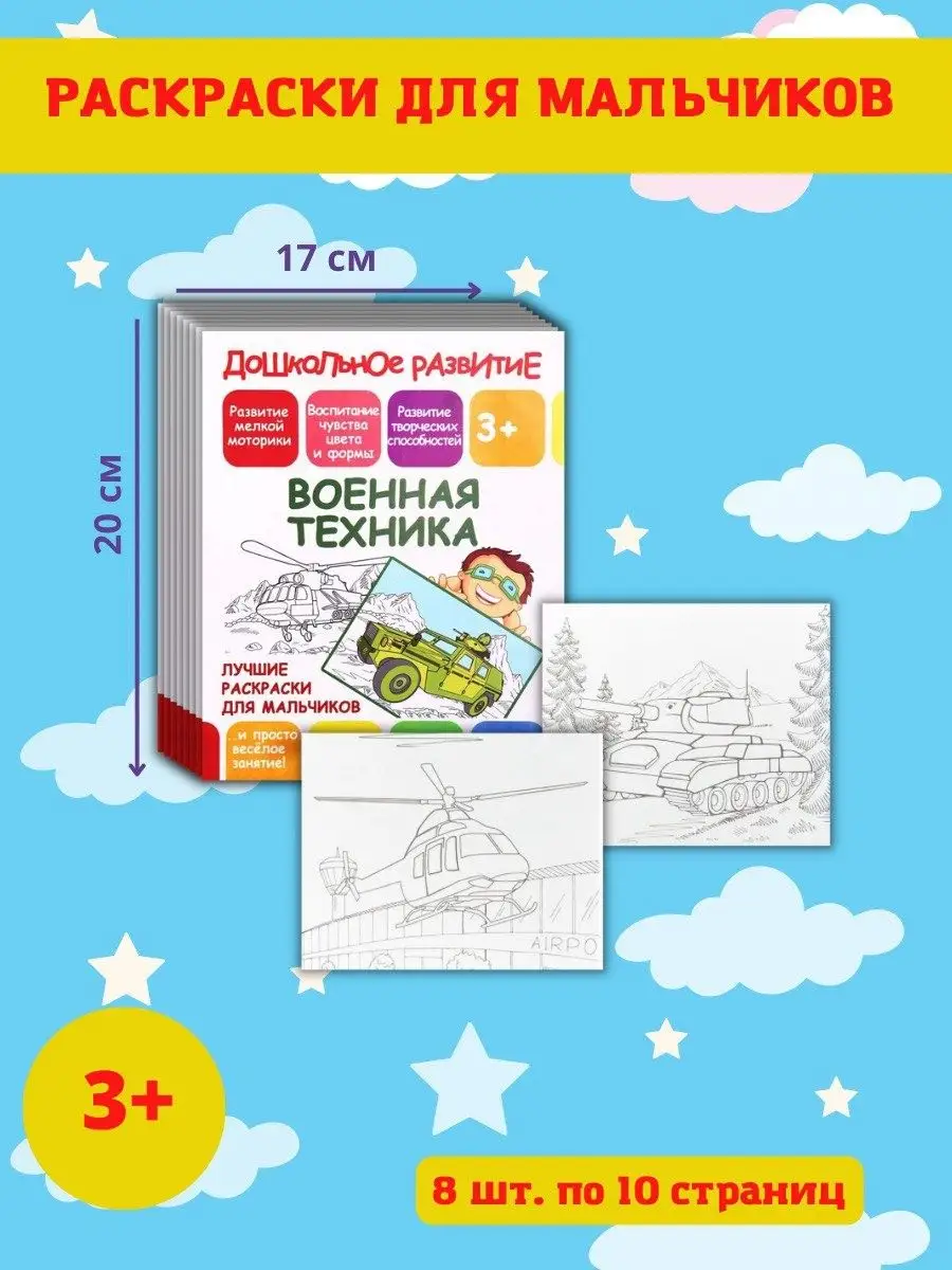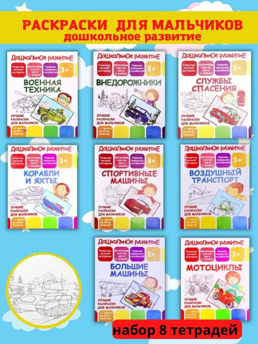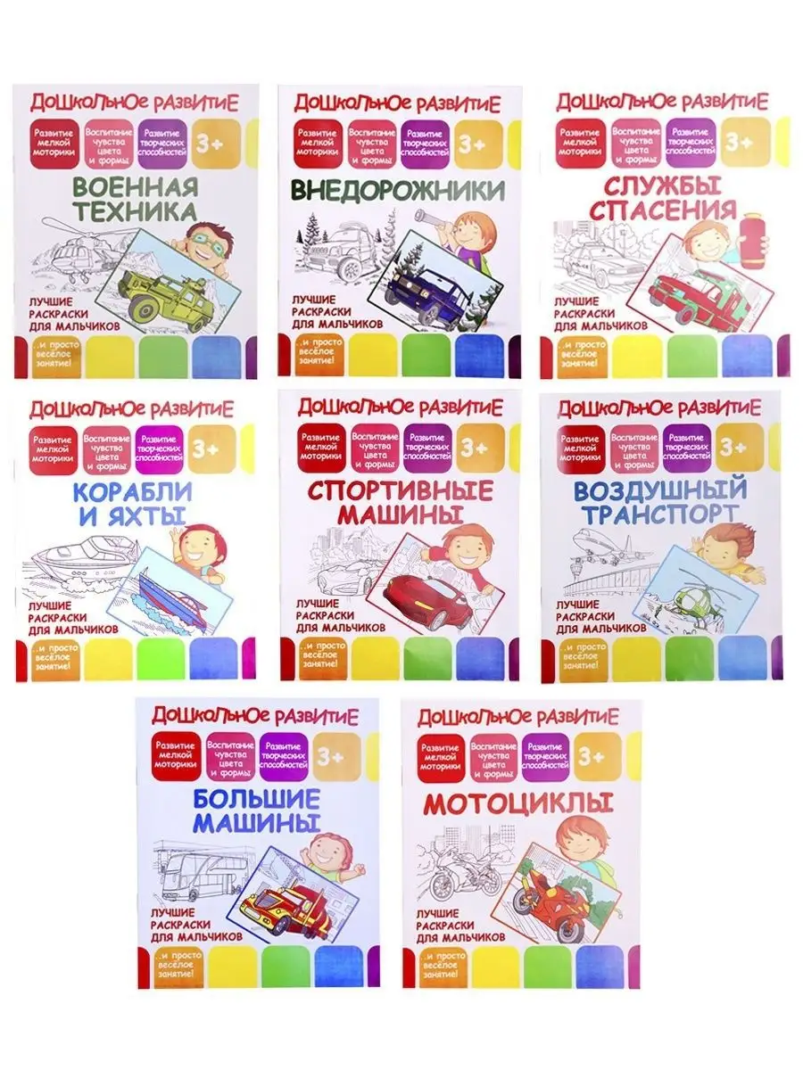 Описание: Вашему вниманию представлен комплект из 8 раскрасок. Высокого класса, способствующий дошкольному развитию ребенка. Большие машины.Внедорожники. Военная техника. Воздушный транспорт. Корабли и яхты. Мотоциклы. Службы спасения. Спортивные машины. Раскраски несут несомненную пользу для детей любого возраста. Малыш изучает разные формы, фигуры и картинки. Рассказывайте ребенку что перед ним, объясняйте каких животных он видит, так ребенок научится чему-то новому и будет расширять свой словарный запас. Во время раскрашивания ребенок развивает моторику рук, учится усидчивости и терпению.