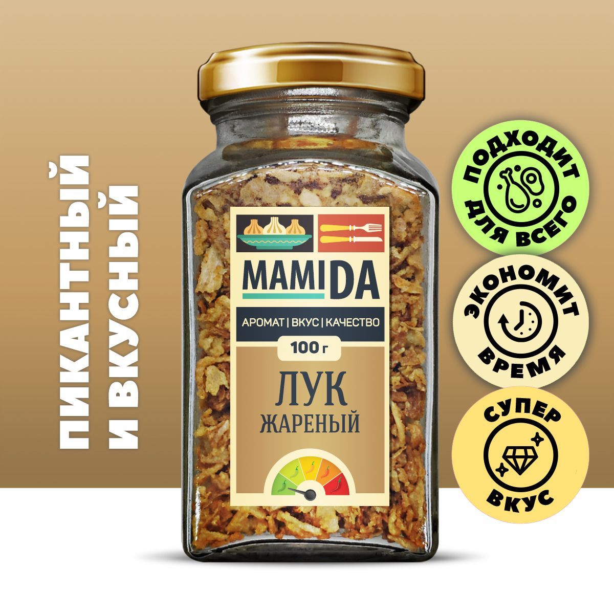 Описание: Жареный лук широко используется в кулинарии для приготовления блюд, кроме того, его едят и как самостоятельную закуску. Золотистый хрустящий репчатый лук, поджаренный на растительном масле, БЕЗ ГМО и консервантов придаст изысканный вкус и утончённый аромат к вашему блюду. Способ применения: добавлять по вкусу при приготовлении соусов, первых и вторых блюд, посыпьте гамбургеры и хот-доги, салаты, используйте для панировки и украшения блюда. Специи и приправы МамиДА - лучший подарок на любой праздник для ваших любимых!