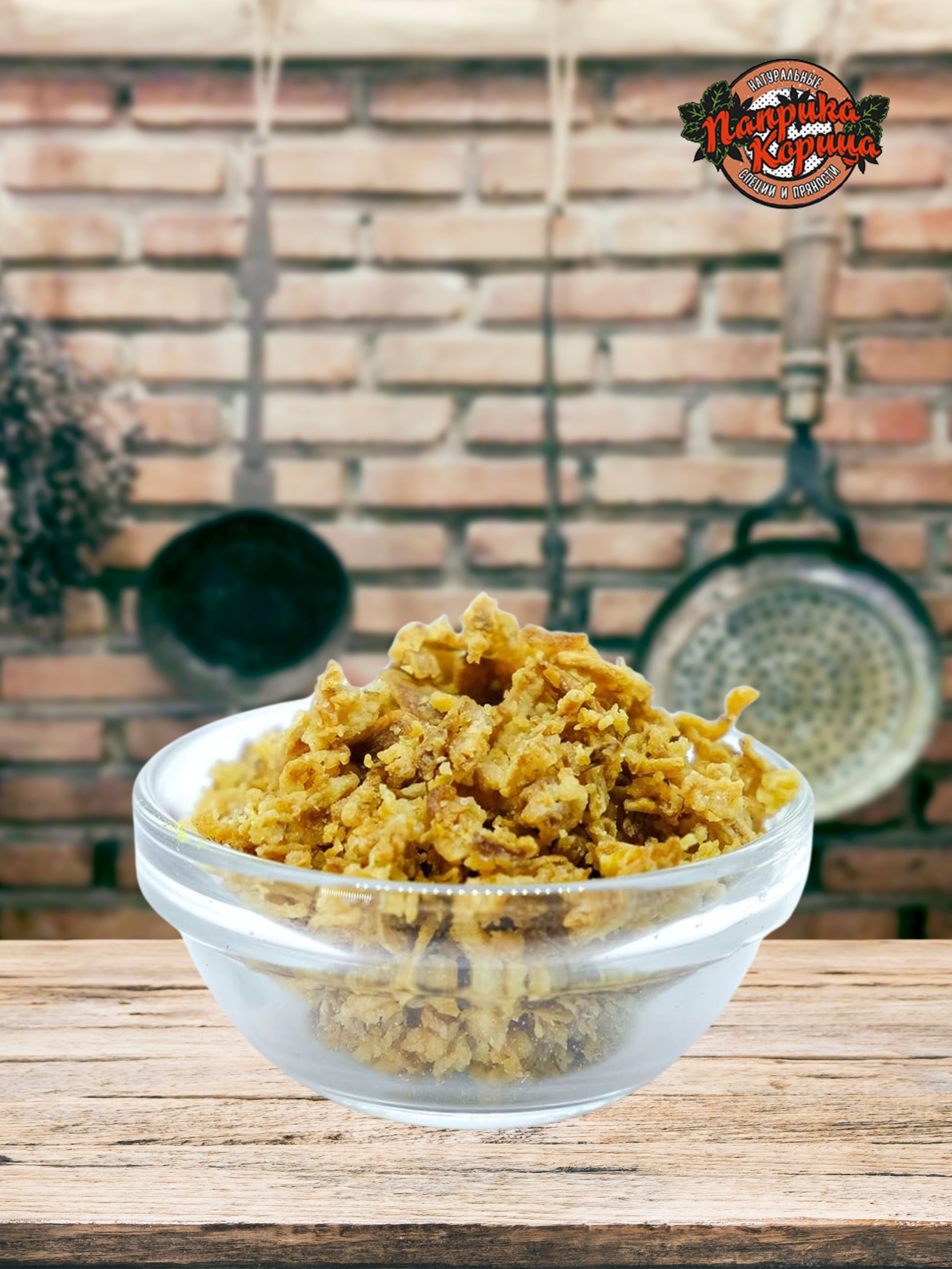 Описание: Лук жареный в хлопьях (90 гр) – пикантная ароматная приправа с ярким насыщенным вкусом золотисто-коричневого цвета. Высушенный лук уже почищен, нарезан и пожарен на качественном растительном масле – не заставит «плакать» и сэкономит время при приготовлении пищи. Готовый жареный лук широко используется в азиатской кухне и вегетарианских блюдах. Хрустящий лук также можно добавить в любое мясное, рыбное и овощное блюдо, салаты и супы.