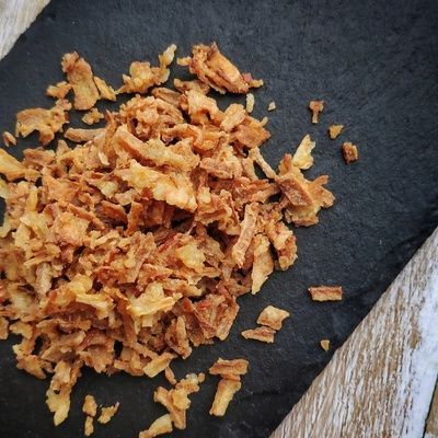 Описание: Добавление жареного лука придает продуктам отличный вкус. Если добавить жареный лук при замесе теста, выпечка приобретет незабываемый аромат и вкус. Жареный сушеный лук источник кислот, витаминов, минеральных элементов, а значит жизненной энергии. Золотисто-коричневый хрустящий лук, поджаренный на чистом растительном масле, без консервантов.