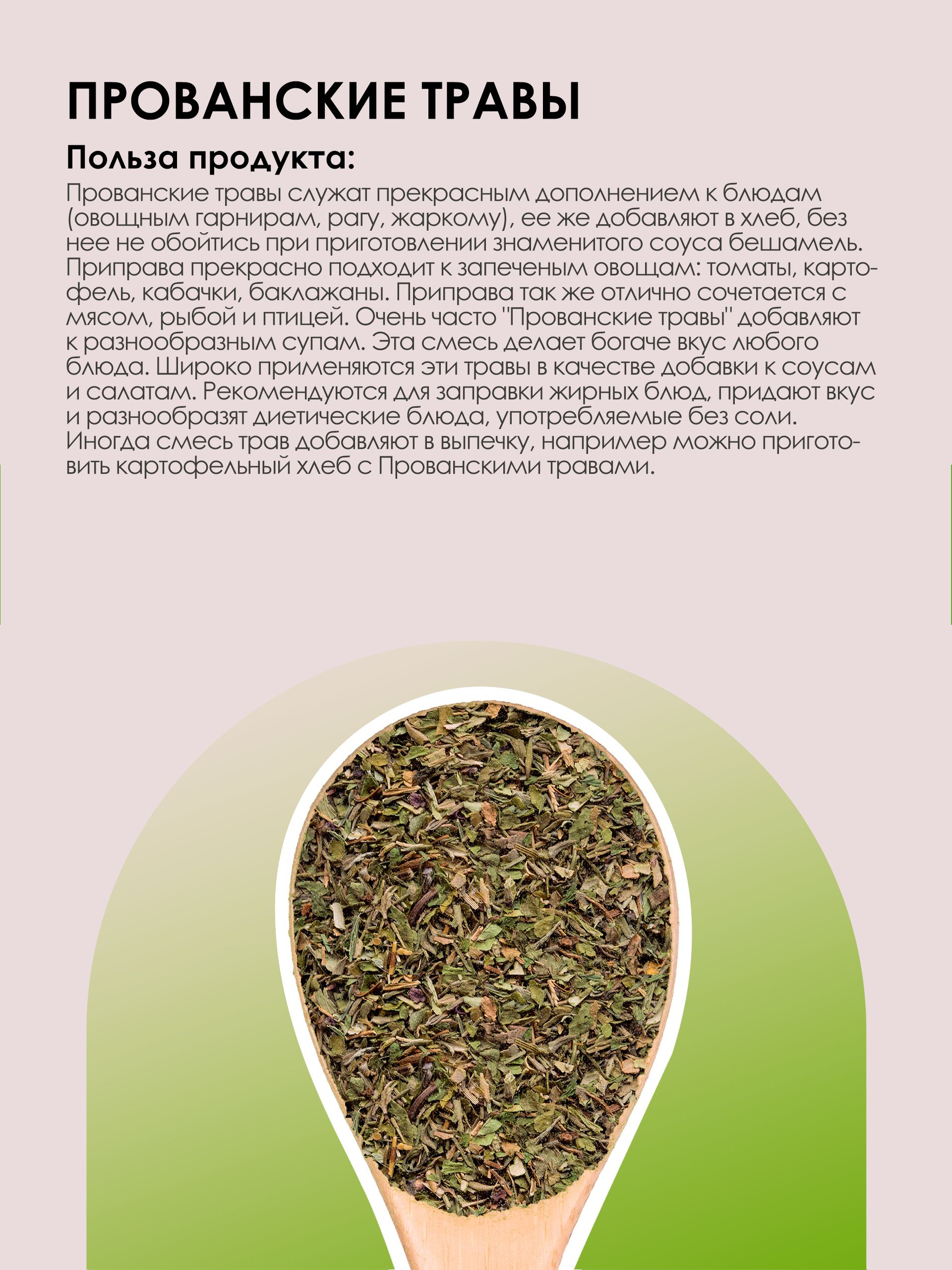 Текст при отключенной в браузере загрузке изображенийНасыщенная пряность. Приправа также отлично сочетается с мясом, рыбой и птицей. Очень часто "Прованские травы" добавляют к разнообразным супам. Эта смесь делает богаче вкус любого блюда.