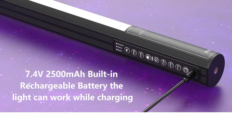 • Встроенный аккумулятор: Встроенный аккумулятор 2500 мАч 7,4 V 18,5 Втч. После полной зарядки Время непрерывного освещения составляет до 1 часа в режиме 100% яркости белого светильник. До 3 часов в режиме 100% яркости RGB светильник. С зарядным портом Type-C и временем зарядки около 2 часов (требуется адаптер более 18 Вт). Его можно заряжать различными способами питания, такими как компьютеры, адаптеры, блоки питания