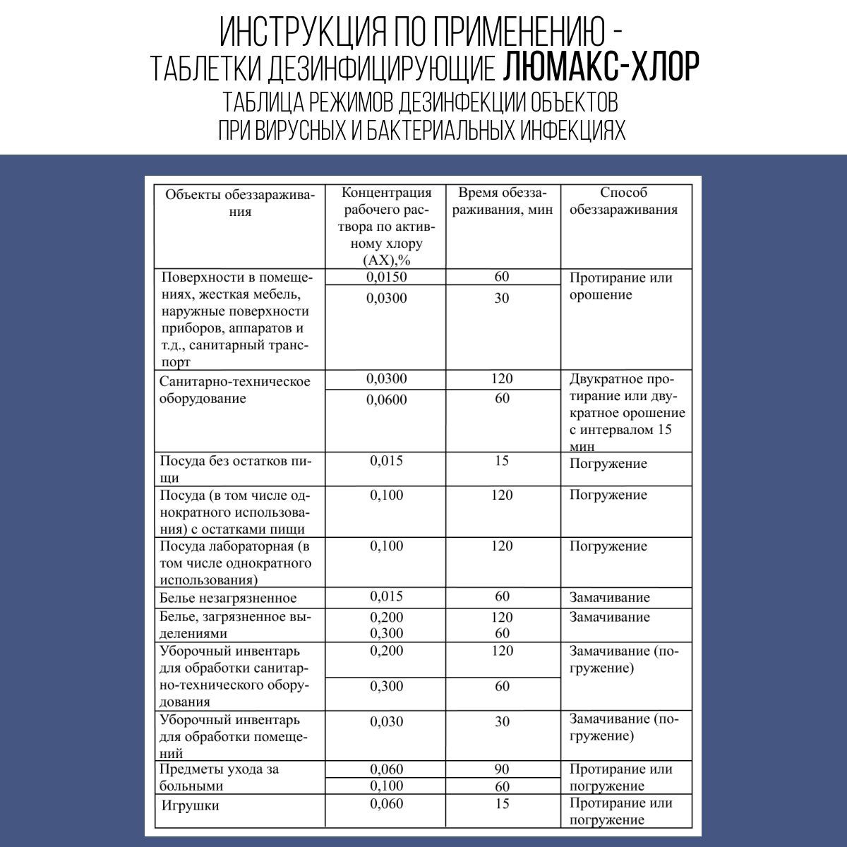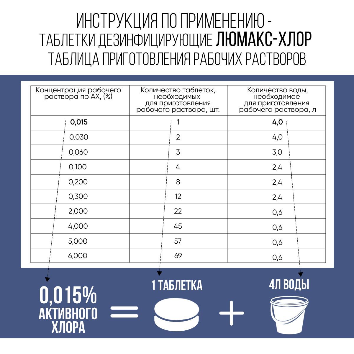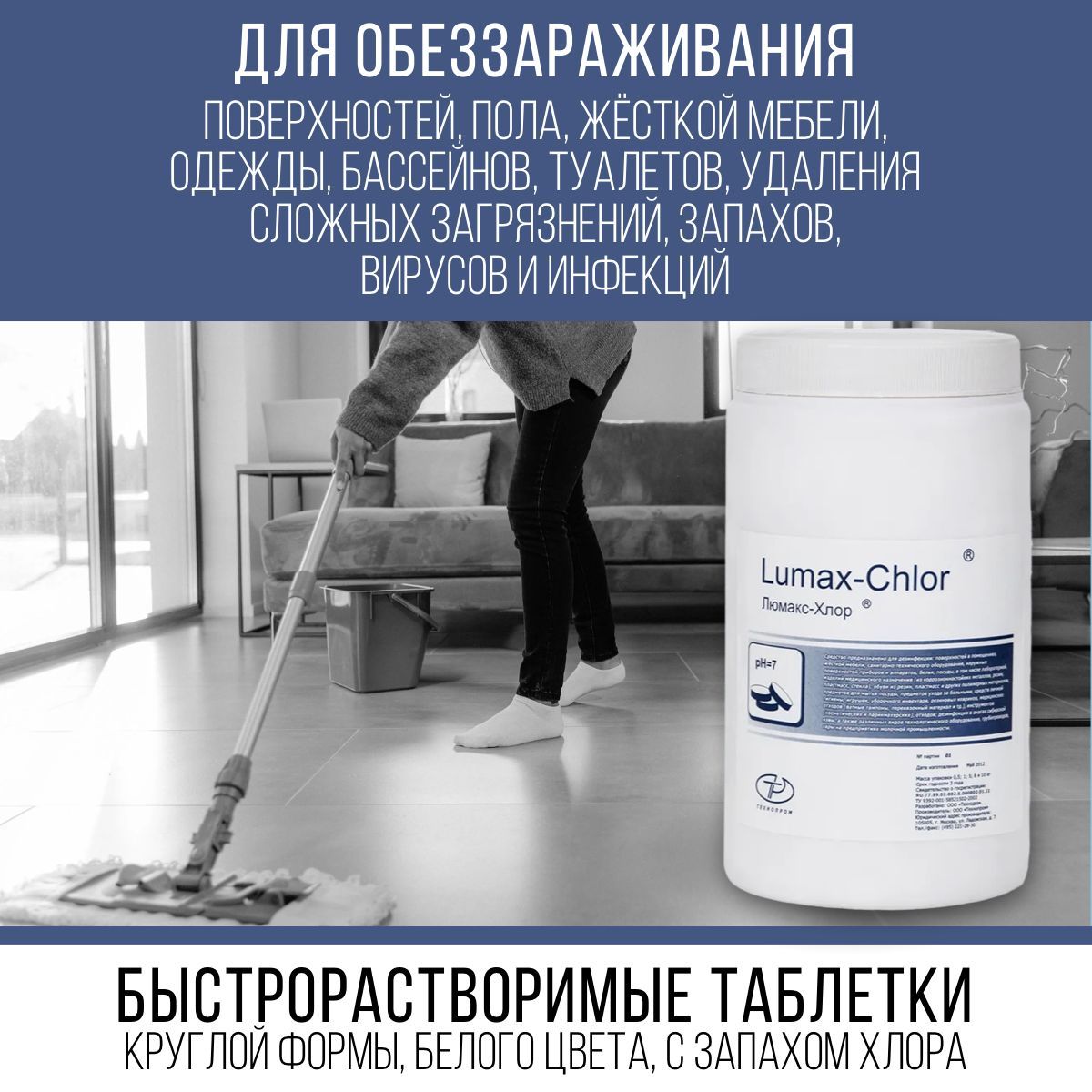 Описание: Хлорные таблетки Люмакс хлор 1 кг представлены в упаковках из 1000 таблеток по 1 г. Дезинфицирующее средство в виде таблеток хлорки применяется для дезинфекции различных поверхностей. Обеззараживание антисептиком происходит за счет действия активного газообразного хлора, который выделяется в воде при растворении сухой хлорки (таблетки или порошок). Время растворения хлорной таблетки для дезинфекции около 6 минут. Дезинфекцию и уборку проводят различными способами: протирание дезинфицирующим хлорным раствором, орошение с помощью аэрозоля, замачивание в концентрате. Хлорка в таблетках подойдет для дезинфекции, уборки, стерилизации различных промышленных, бытовых помещений и объектов (бассейн, ванная, унитаз, инструменты, полы и стены). Дезинфицирующий дез раствор для маникюрных инструментов подойдет салонам красоты для дезинфекции инструментов для маникюра и педикюра. Раствор хлорки можно использовать как отбеливатель для белья (белизна в таблетках). Таблетки для унитаза в бочок можно использовать в общественных туалетах гостиниц, санаториев, домов отдыха, бань и саун, парикмахерских и тд.). Средство от плесени лучше использовать после механической очистки обрабатываемой поверхности с помощью скребка и последующего просушивания. Дезинфицирующие шипучие таблетки хлора для очистки бассейна в виде натриевой соли избавят его от цветения и неприятного запаха. Дезинфекция и антисептика моющим средством для мытья полов с хлором избавит вас от всех биологических бактерий, вирусов, плесневых грибов и других возбудителей. После окончания дезинфекции поверхностей чудо препаратом в помещении следует провести влажную уборку от дезинфектора и проветрить помещение. Деревянные поверхности необходимо протереть сухой тряпкой. Концентрацию универсального специального чистящего средства и последовательность обработки поверхностей для дезинфекции, стерилизации утилизации смотрите в карточке товара на фото. В 1 банке - хлорные таблетки 1000 шт. Не забудьте зайти в наш магазин, нажав логотип, для просмотра всего каталога.