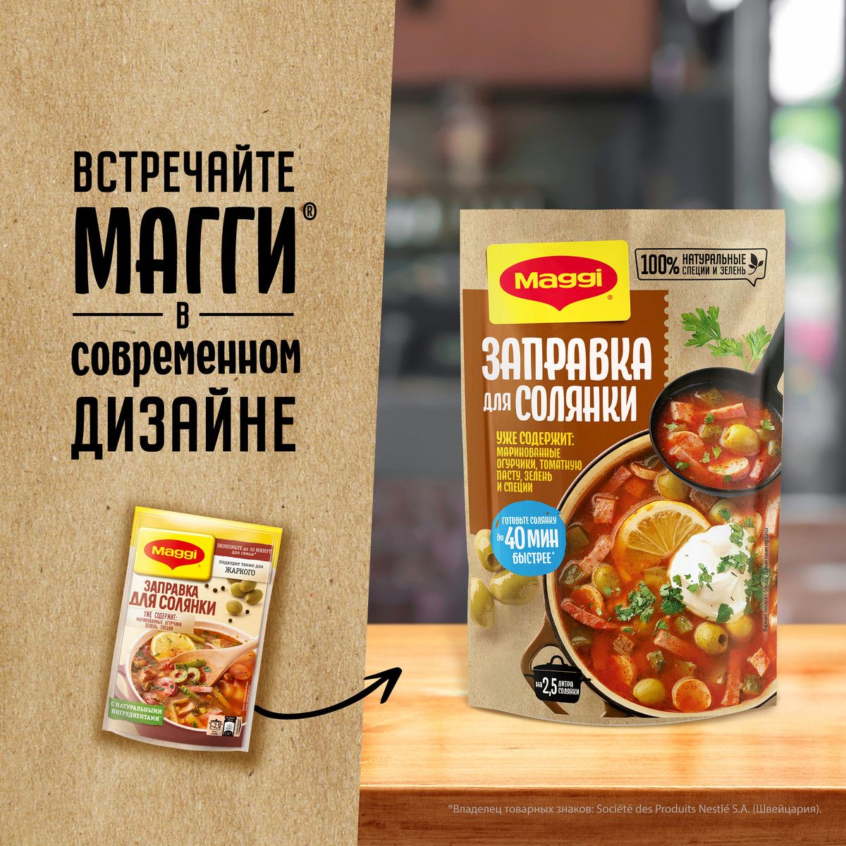 Описание: Солянка традиционный суп русской кухни. Наваристый, густой суп на мясном, рыбном или грибном бульоне никого не оставит равнодушным! А с MAGGI Заправкой для солянки вы сможете чаще радовать семью любимым вариантом супа без лишних усилий. MAGGI Заправка для солянки приготовлена из отборных овощей, с маринованными огурчиками, греческими оливками и душистыми специями. MAGGI - с заботой о важном. Только знакомые ингредиенты. На 2,5 л солянки вам понадобится: МАГГИ® Заправка для солянки - 180 г, куриная грудка - 200 г, копченые сосиски - 3 шт., карбонад - 100 г, картофель - 4 шт. (~ 250 г), лук репчатый - 1/2 шт., растительное масло - 1 ч. ложка.  1. Сварите 1,5 л бульона из куриной грудки, добавьте нарезанный картофель. 2. Лук нарежьте полукольцами и обжарьте до золотистого цвета. 3. Когда картофель будет готов, добавьте копчености и лук, варите 2 мин. 4. Добавьте Заправку MAGGI® для солянки и варите еще 5 мин. Рекомендуем подавать  солянку с оливками,  долькой лимона и зеленью.