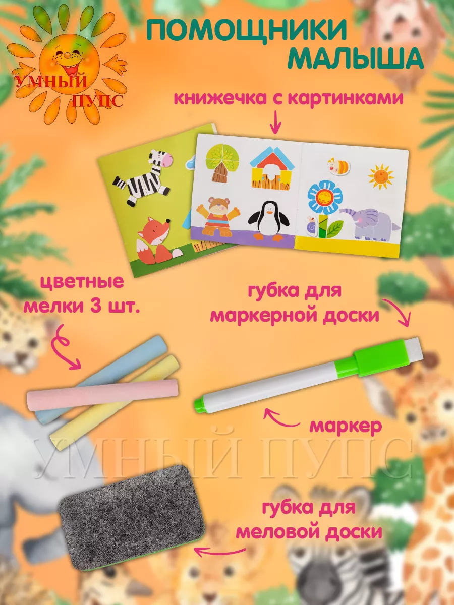 Комплектация коробка-пенал для хранения; цветные мелки, фломастер; книжка иллюстрированная; губка для стирания; магнитные пазлы фигуры