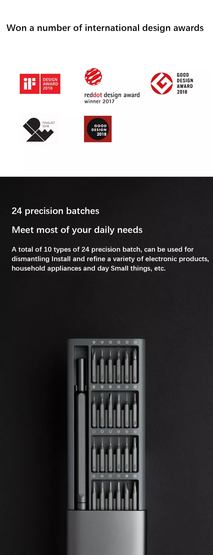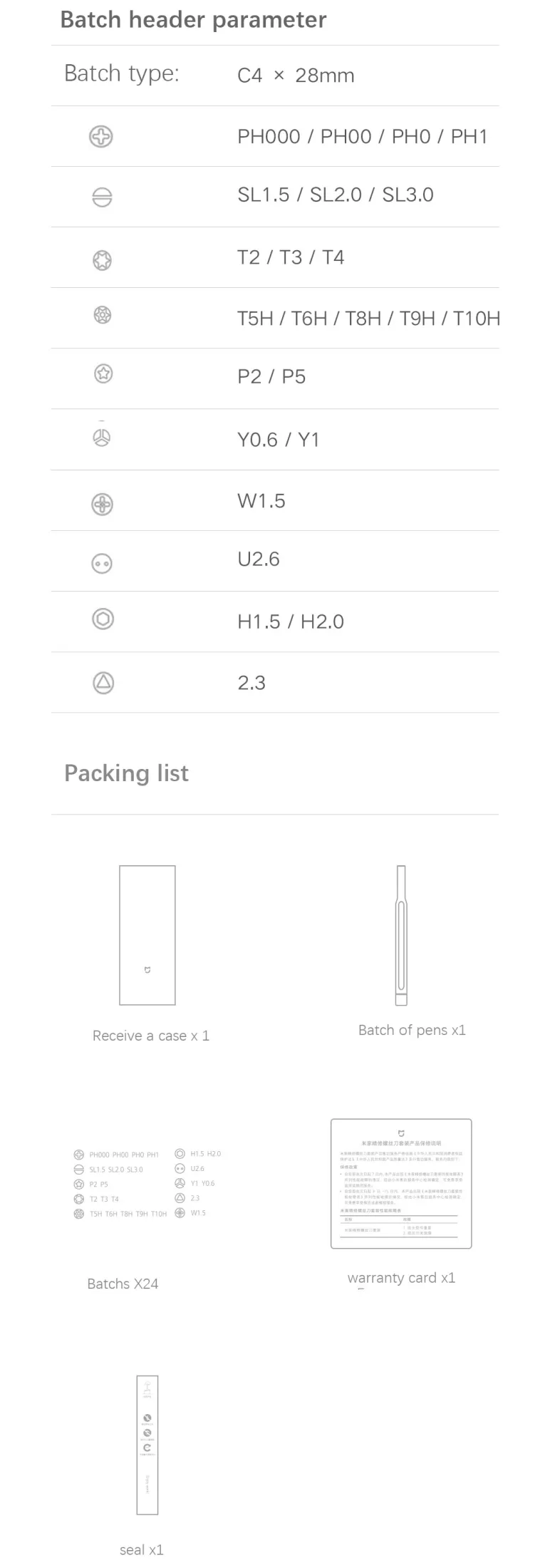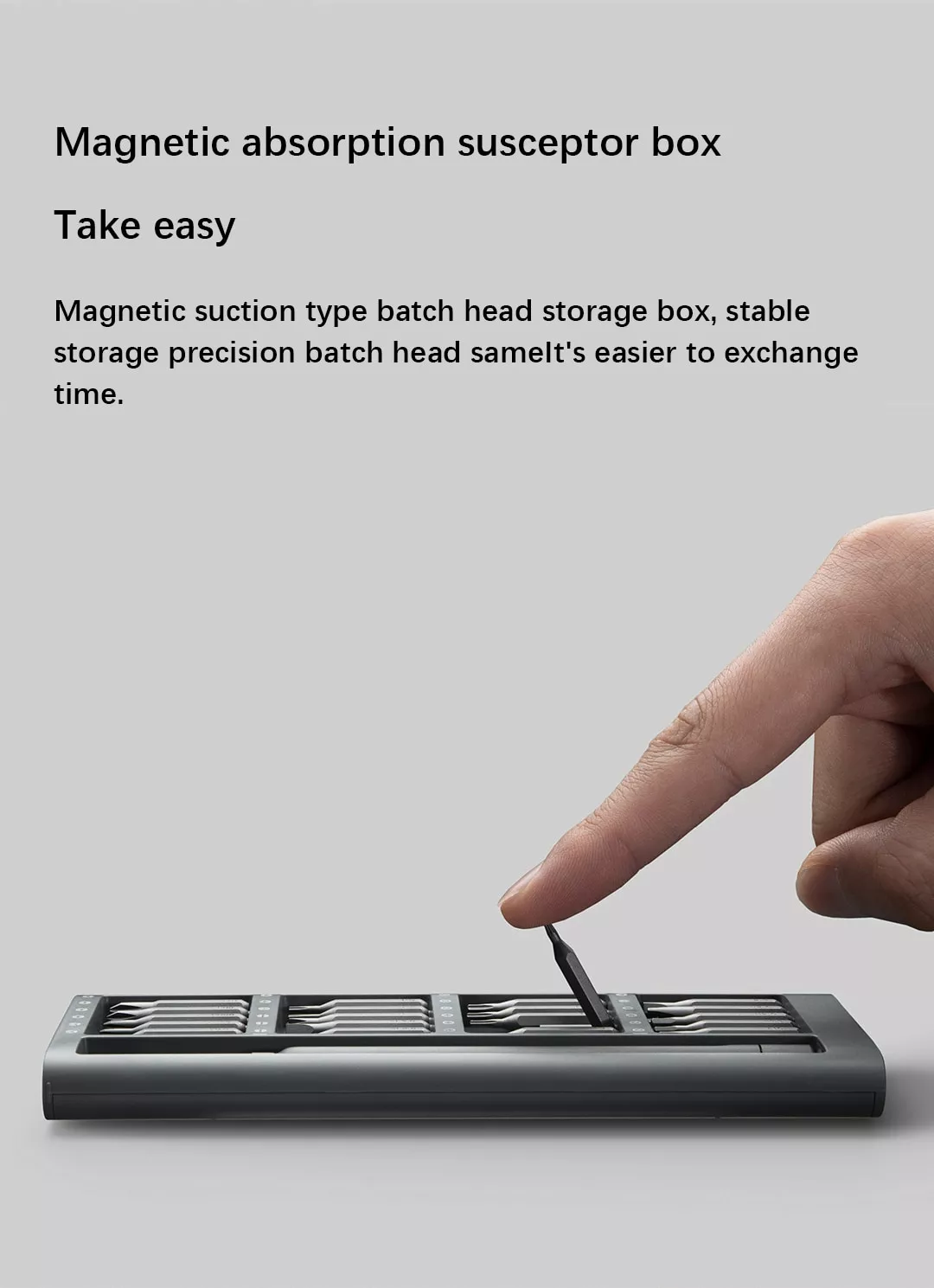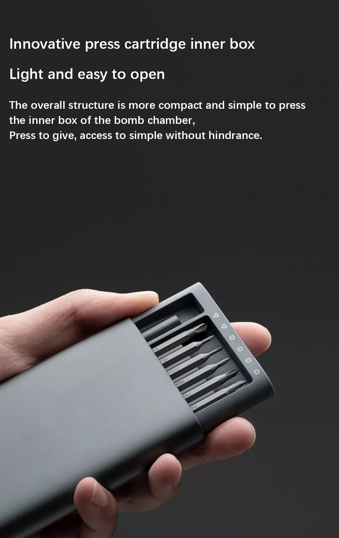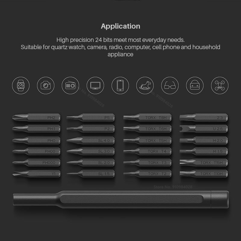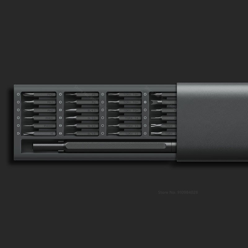 Комплектация: 1 ручка для отвертки, 24 бита, 1 ящик для хранения из алюминиевого сплава