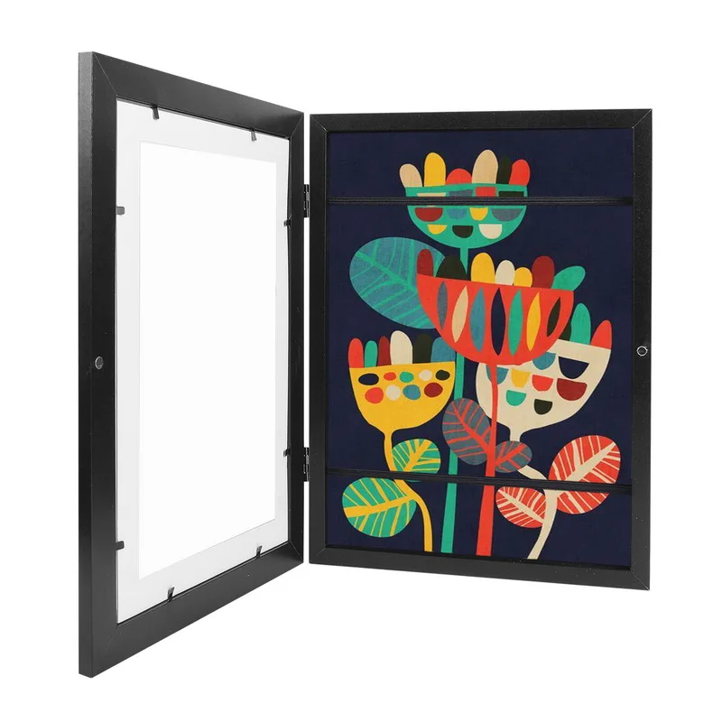 Вы можете открывать и закрывать так же, как книгу, с двойной фиксированной картиной и черной резинкой с металлическими штырями для стабилизации отображения произведений искусства.