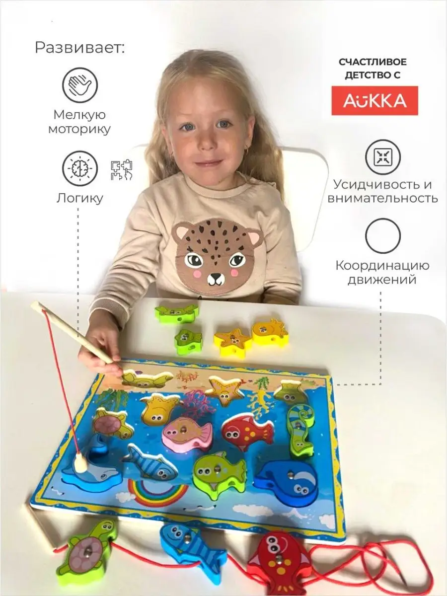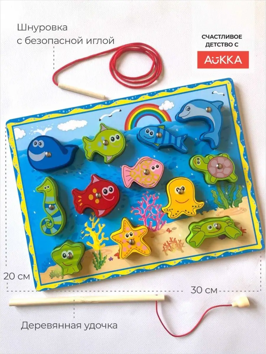 Комплектация Магнитная удочка - 1 шт; Деревянные рыбки - 15 шт; "игла" с шнурком - 1шт.