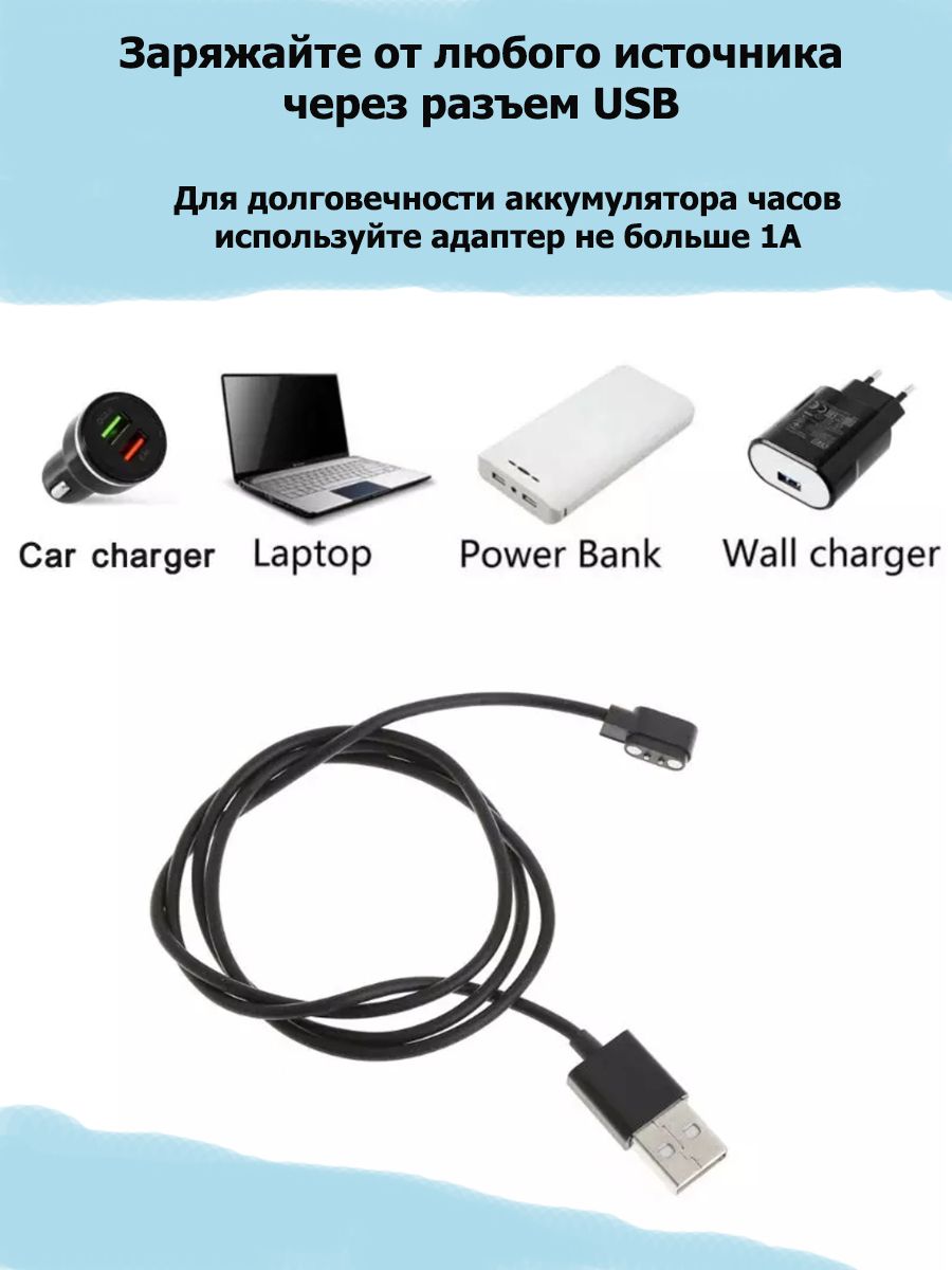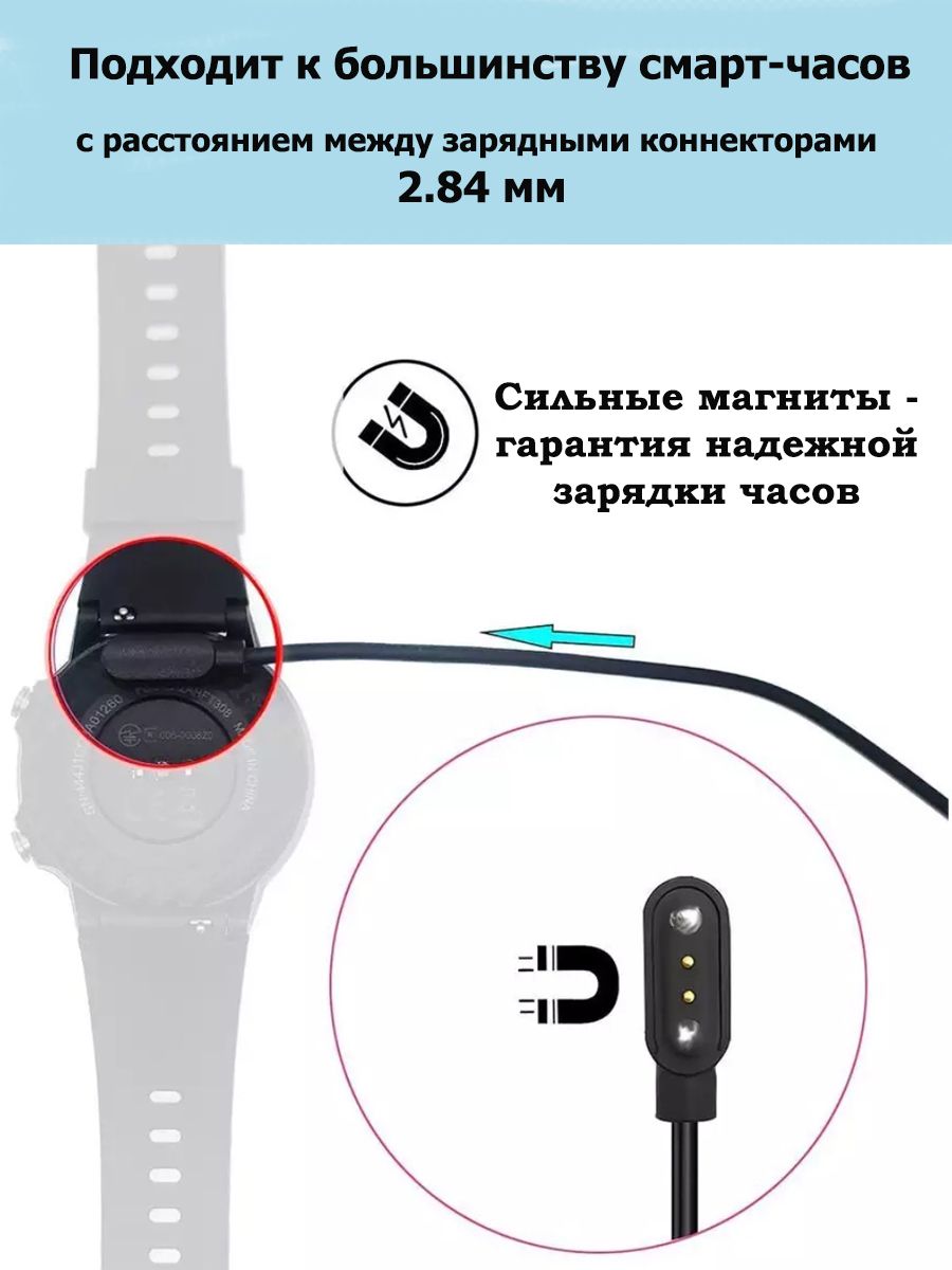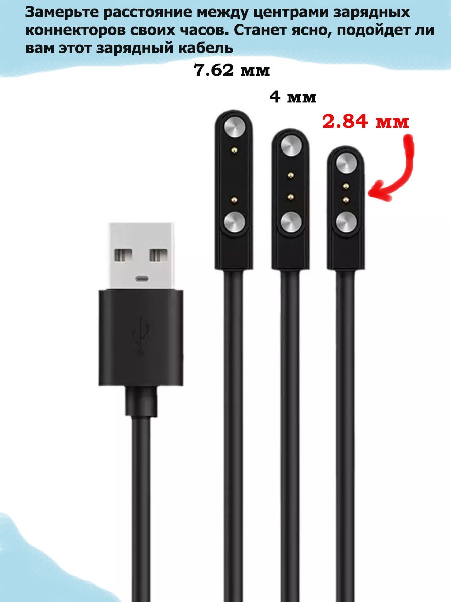 Описание: Кабель зарядка магнитная USB с 2 pin для смарт часов. Расстояние между зарядными коннекторами 2,84 мм. Это качественный и надежный магнитный кабель питания для умных часов и фитнес браслетов. Длина usb кабеля юсб быстрой зарядки 60 см. Зарядник для умных часов черного цвета. Провод питания 2 pin ( пин ) 2,84 мм подходит, например, для таких смарт часов: KingWear KW10, KW20, LW10, LW20, LW20 PRO, Lemfo LT07, smart watch I7S, X22 (Х22), u7 pro, HW16, W13, TB12, FM08, G12, MW09, BY51, X4, X5, R01, H30, DEXP SW86, фитнес-браслет GL W-20, геликон лайн и других моделей с расстоянием между зарядными коннекторами 2,84 (2,9; 2,5; 3) мм. Так же, кабель заряжает устройство bubble mini (Бабл мини) и Bluetooth-наушники TRN BT3S PRO.