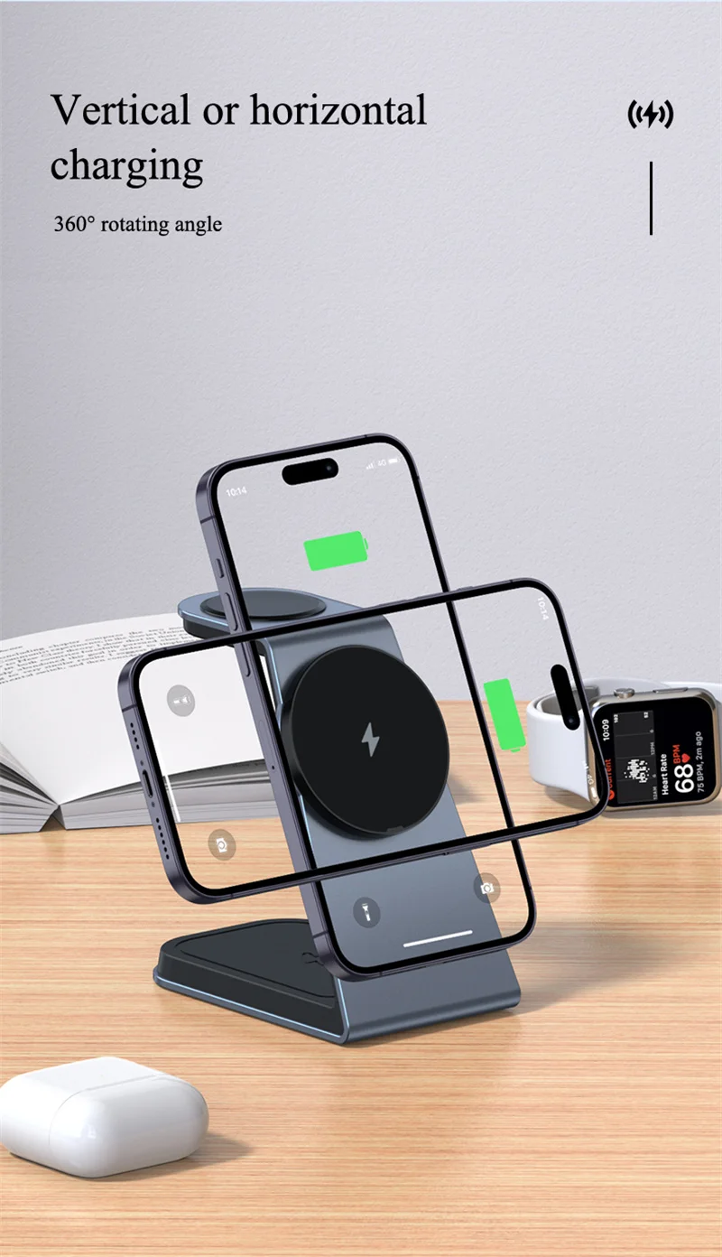 【Обновление алюминия 3 в 1 Беспроводное зарядное устройствоБеспроводное зарядное устройство 3 в 1 изготовлено из высококачественного алюминиевого сплава, которое ускоряет рассеивание тепла и обеспечивает более высокую скорость зарядки, чем пластик. Он также более прочный и долговечный. Эта зарядная станция может заряжать большинство телефонов, поддерживает быструю зарядку нескольких устройств apple одновременно, совместимость с iPhone 14/iPhone 14 Pro/iPhone 14 Pro Max/iPhone 14 Plus/iPhone 13/13 Mini/13 Pro/13 Pro max/12/12 Mini/12 Pro/12 Pro Max, iWatch Ultra/8/7/SE/6/5/4/3/2/1, AirPods 3/2 Pro).