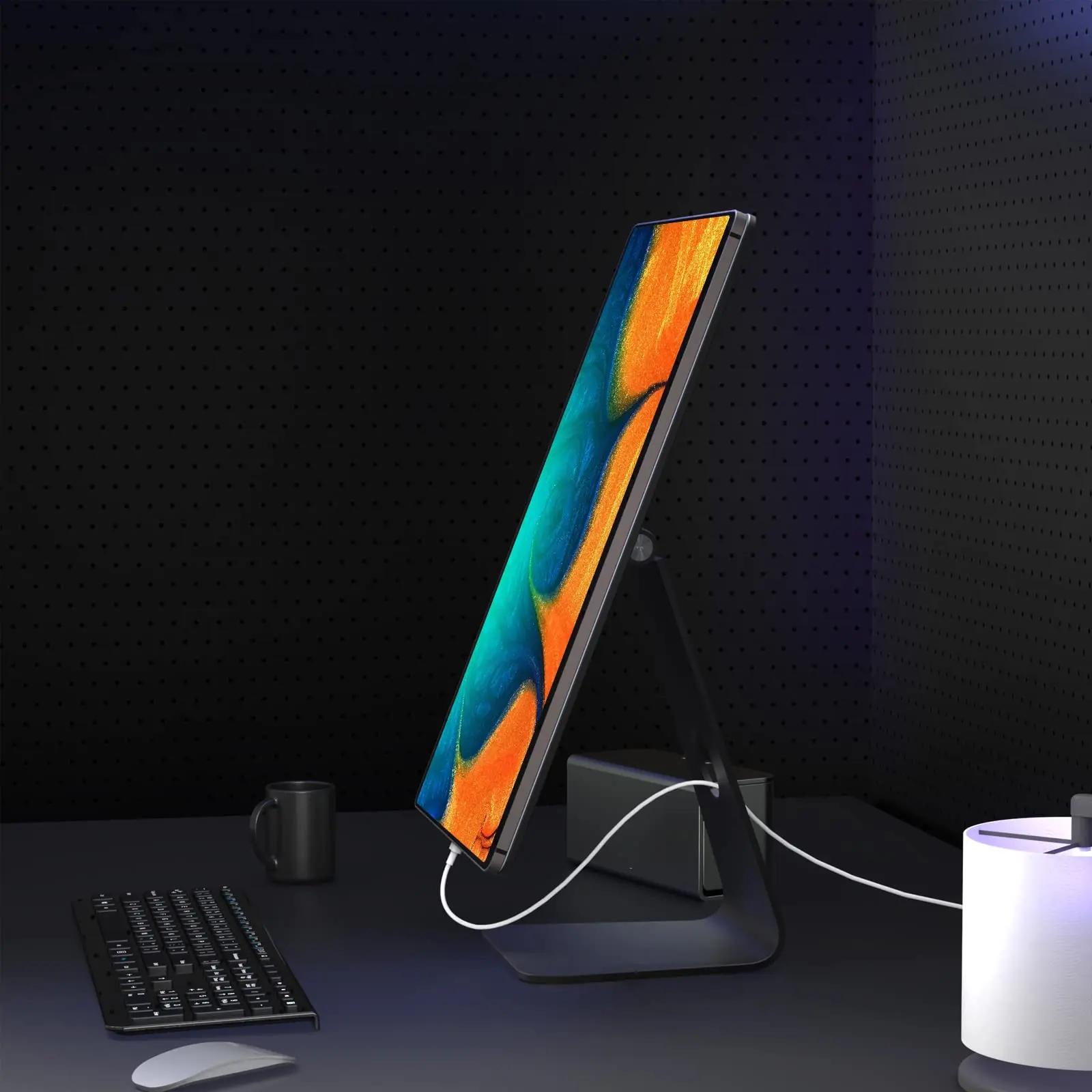 【Современный стиль】 Эта Магнитная подставка для Galaxy Tab изготовлена из чистого алюминия, обладает нежным ощущением и красивым внешним видом. Лучше всего то, что он также полностью совместим с S Pen со встроенным хранилищем для пера. Вы можете легко прикрепить S Pen к планшету через полую область в левом верхнем углу магнитной подставки.