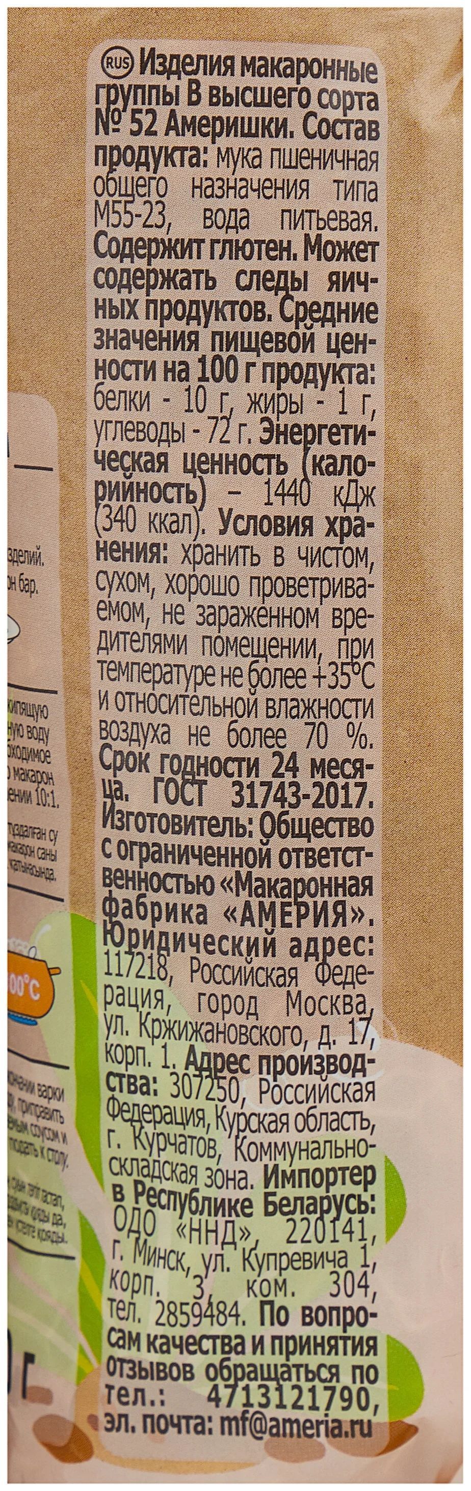 Описание: Детские макаронные изделия для маленьких приверед Америшки , придуманы специально для маленьких гурманов, чтобы привлечь их внимание к еде, Причудливая форма макарон для детей Америшки особенно придется по душе детям, превратив обыденный ужин в увлекательное гастрономическое путешествие. Макароны детские разработана специально для детей и сочетает привлекательный внешний вид с вкусными и полезными свойствами. Маленькие аппетитные фигурки понравятся как малышам, так и их родителям. Макаронные изделия сделаны исключительно из твердой пшеницы с высоким содержанием растительного белка, клетчатки, микроэлементов и витаминов группы "В", что оптимально для ребенка.Макаронные изделия группы "В". Изготовлены из пшеничной муки высшего сорта и очищенной воды. Макаронные изделия «Америя» — собственный бренд нашей компании, выпускаемый на «Макаронной фабрике Америя» в г. Курчатов Курской области. Макароны производятся из мягких сортов пшеницы группы «В» на оборудовании швейцарской фирмы Buhler и итальянской — Fava. Многообразие форматов в том числе линейка яичных, представлены в упаковках 400г, 700г, 900г и 4кг. Макароны этой торговой марки неоднократно становились лауреатами и победителями различных конкурсов. Данная макаронная продукция представлена практически во всех регионах России, ближнем и дальнем зарубежье.