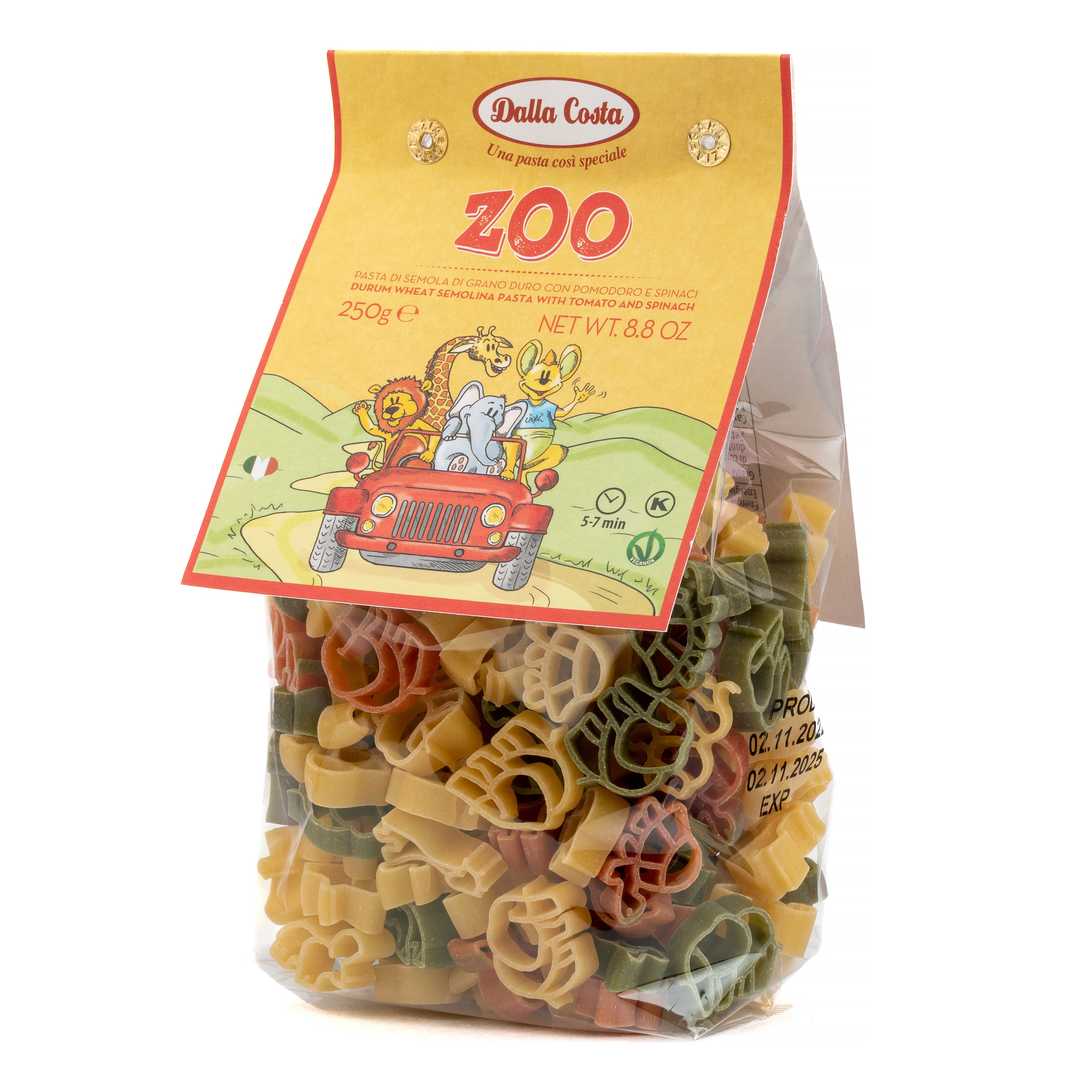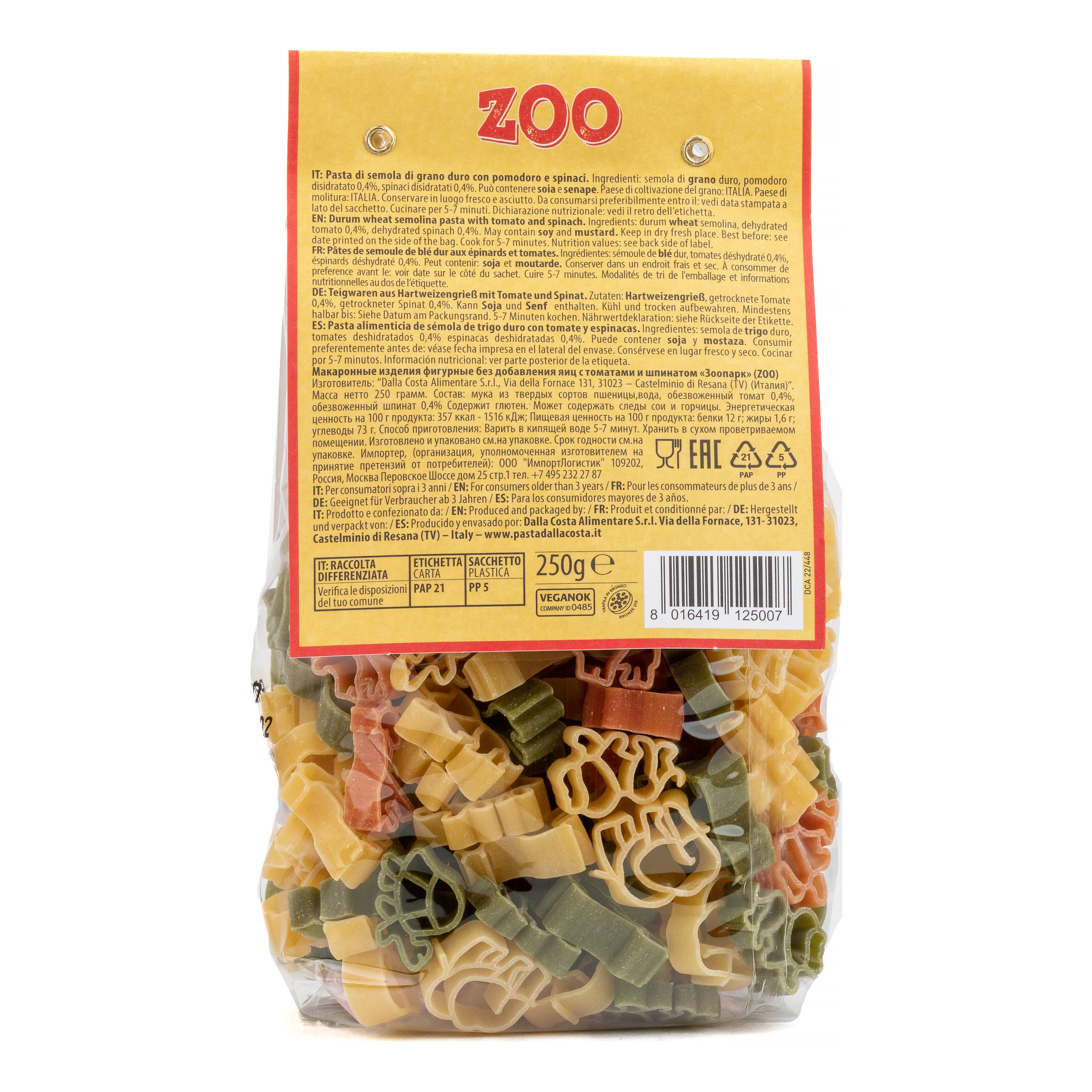 Макаронные изделия Dalla Costa Зоопарк, Фигурные со шпинатом и томатами, 250 г
