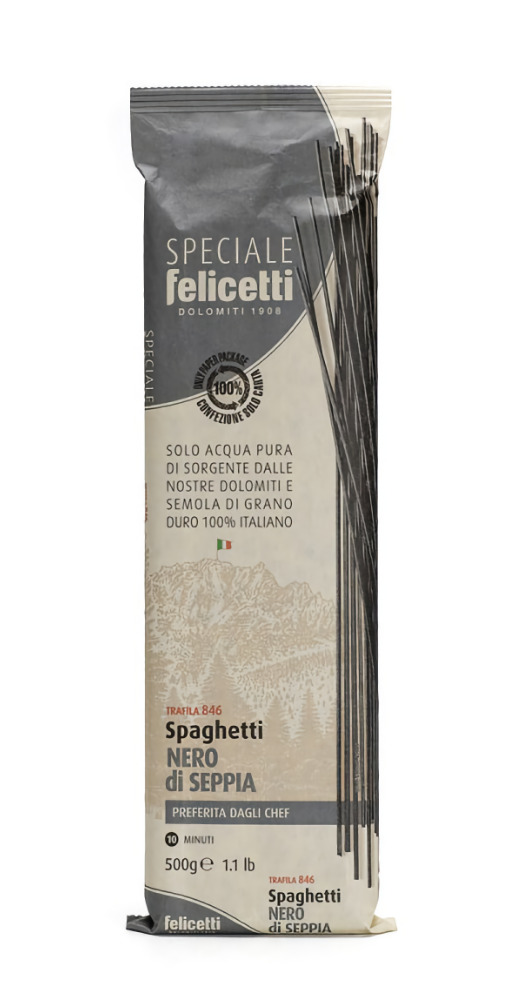 Спагетти с чернилами каракатицы Felicetti великолепно сочетаются с овощными соусами и соусами из рыбы и морепродуктов.